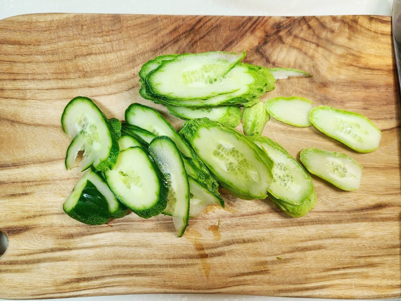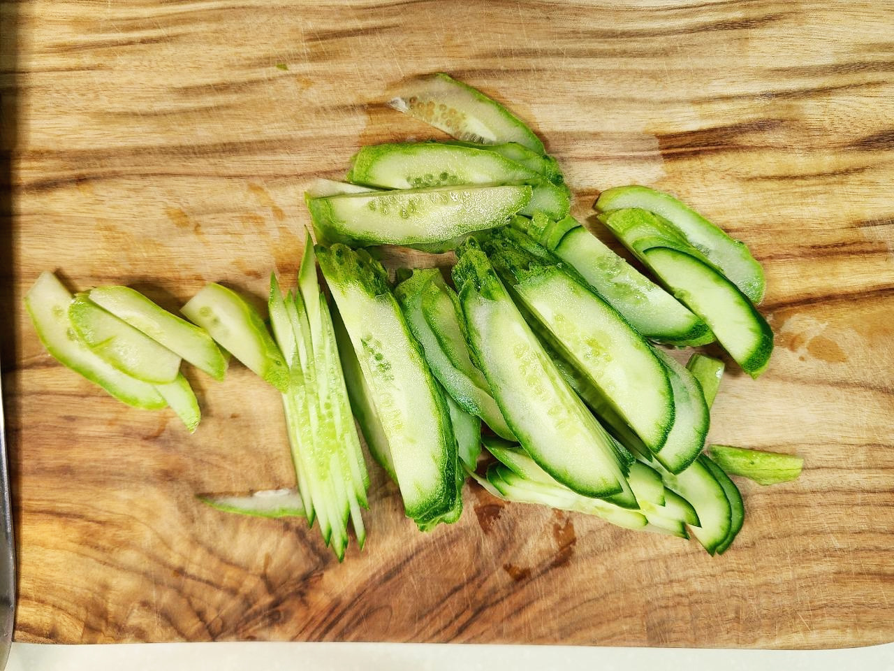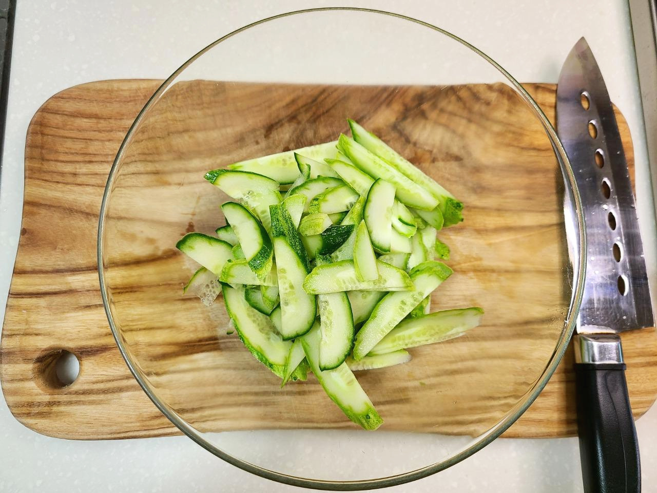 오이는 어슷썬 다음 반으로 잘라 주세요.