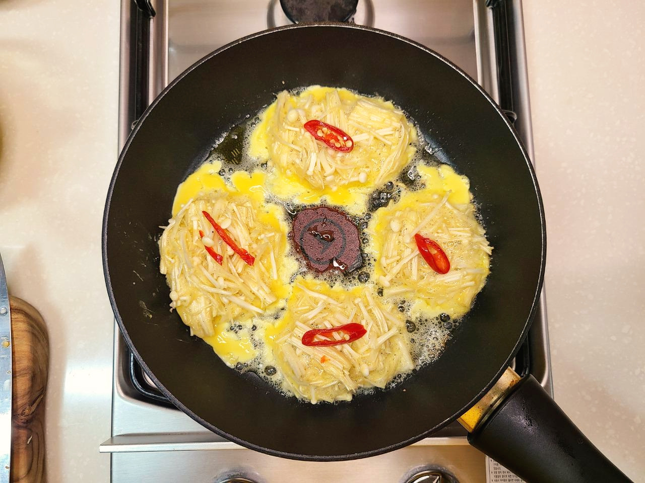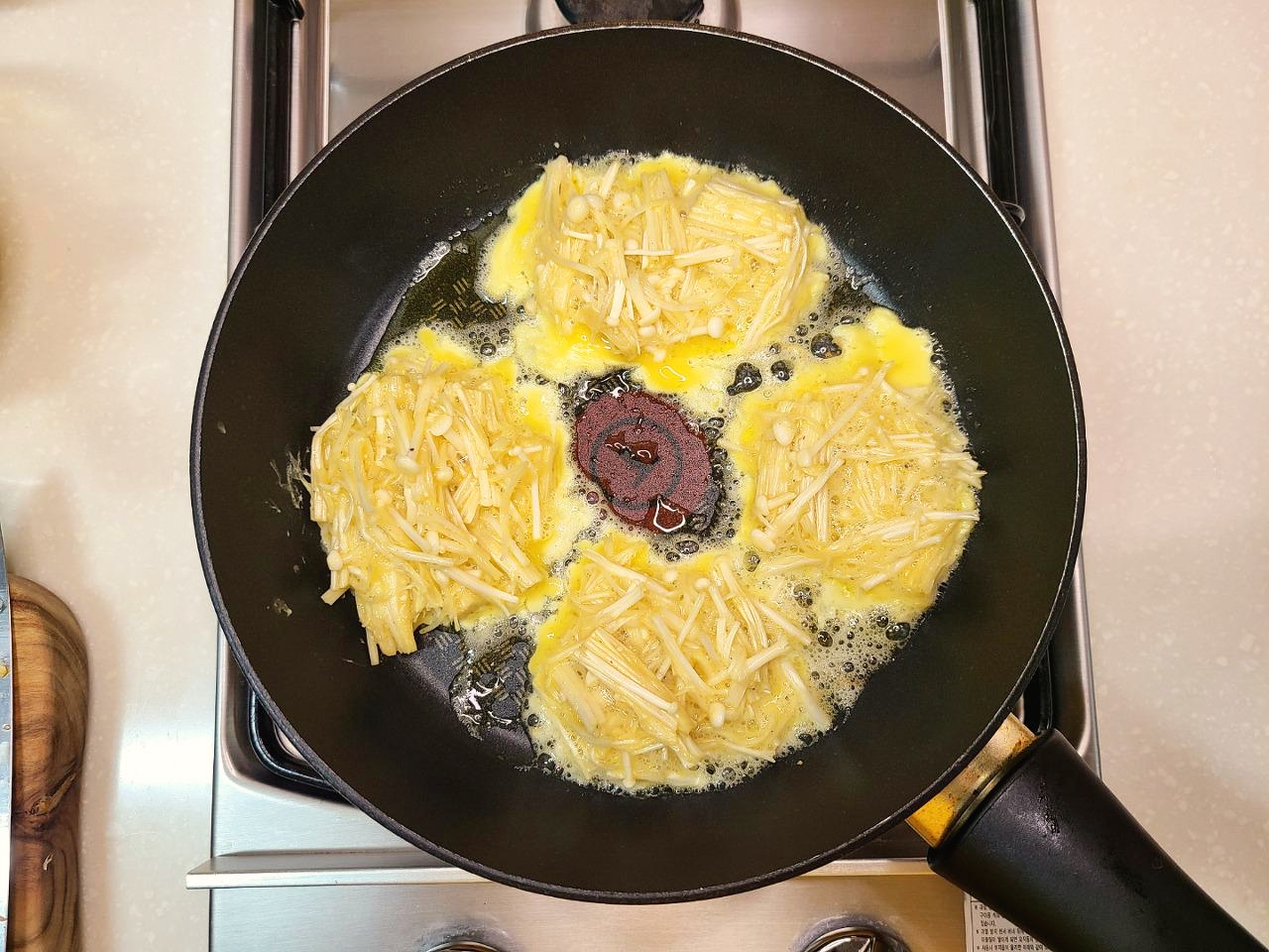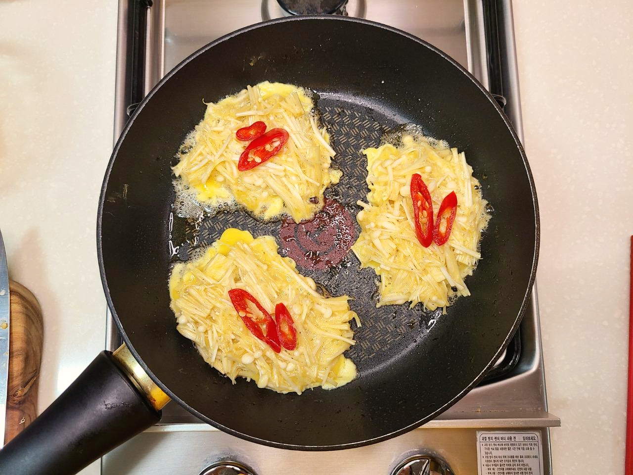 팽이버섯 달걀물을 한 숟가락씩 넣어 부쳐주세요.
