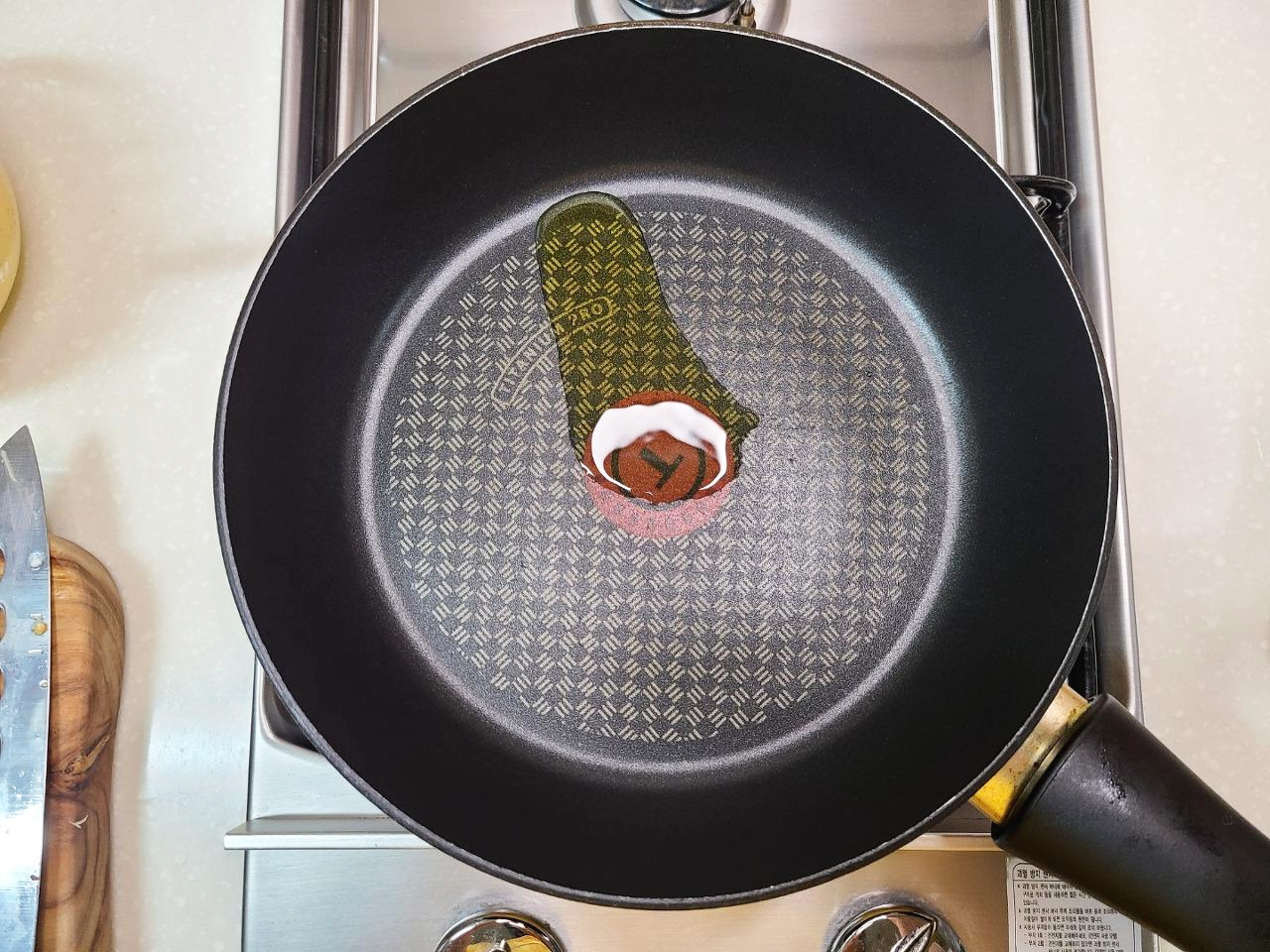 잘 달궈진 팬에 들기름, 올리브유를 1/4T씩 둘러주세요.