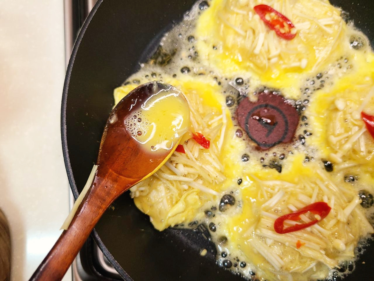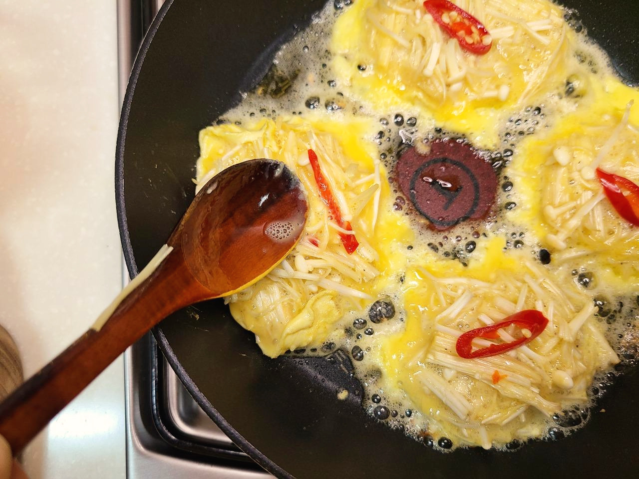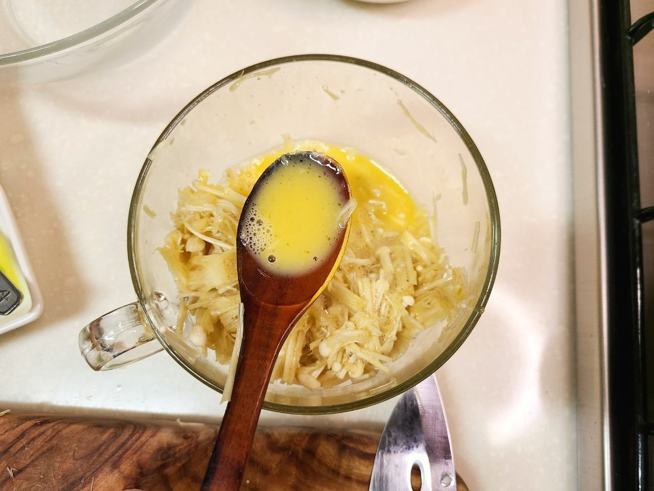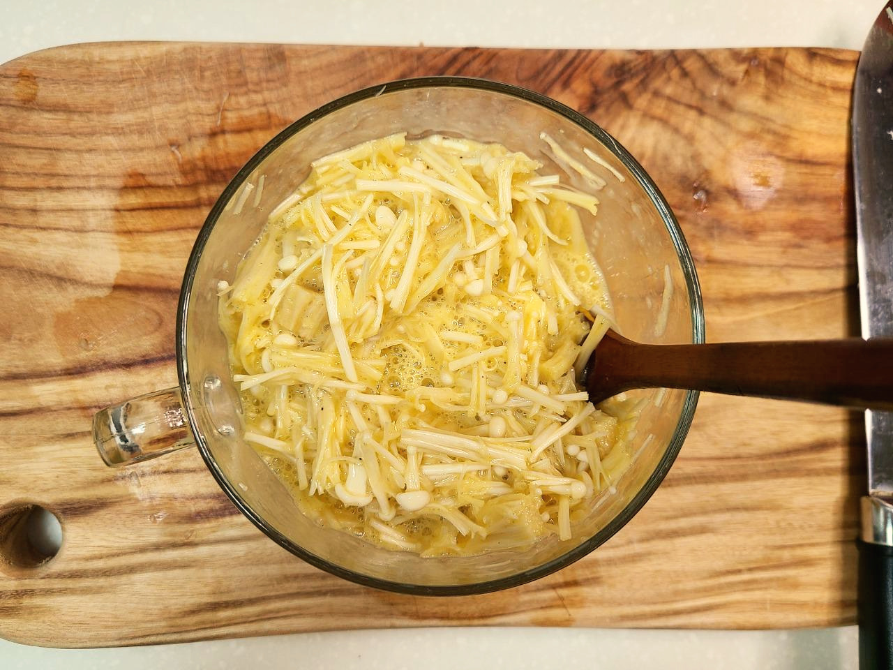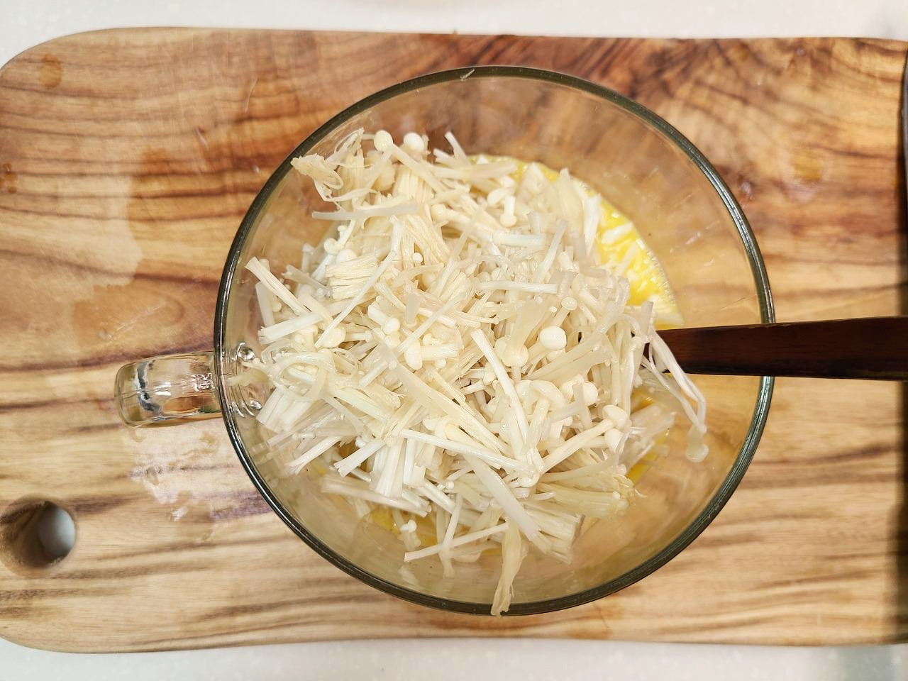 팽이버섯에 달걀물을 잘 섞어주세요.