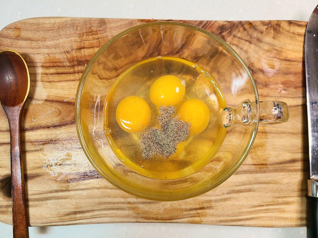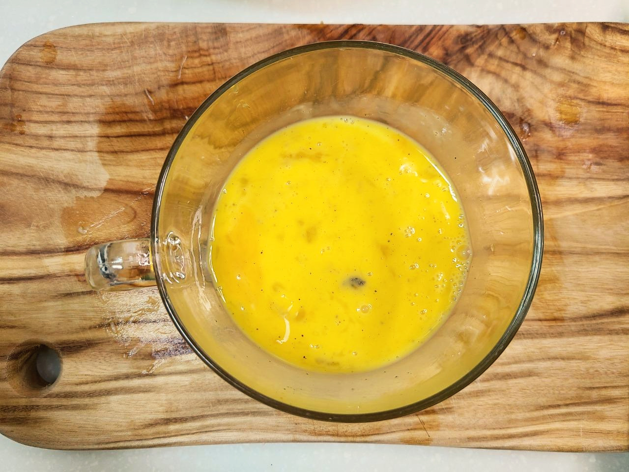 달걀 4개에 후추를 조금 넣은 다음 잘 풀어주세요.