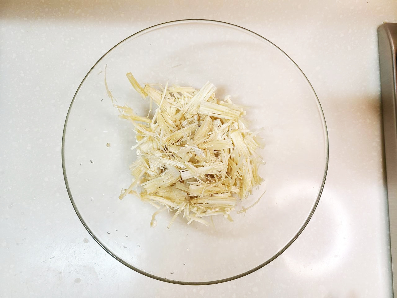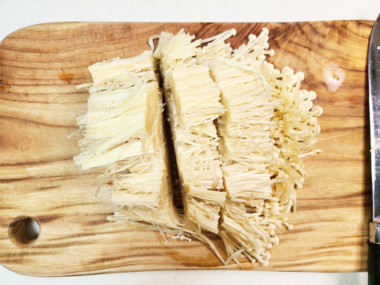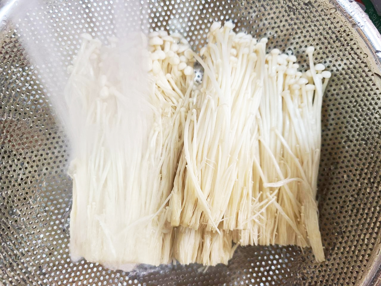 팽이버섯 밑둥을 잘라서 물에 살짝 씻어주세요.