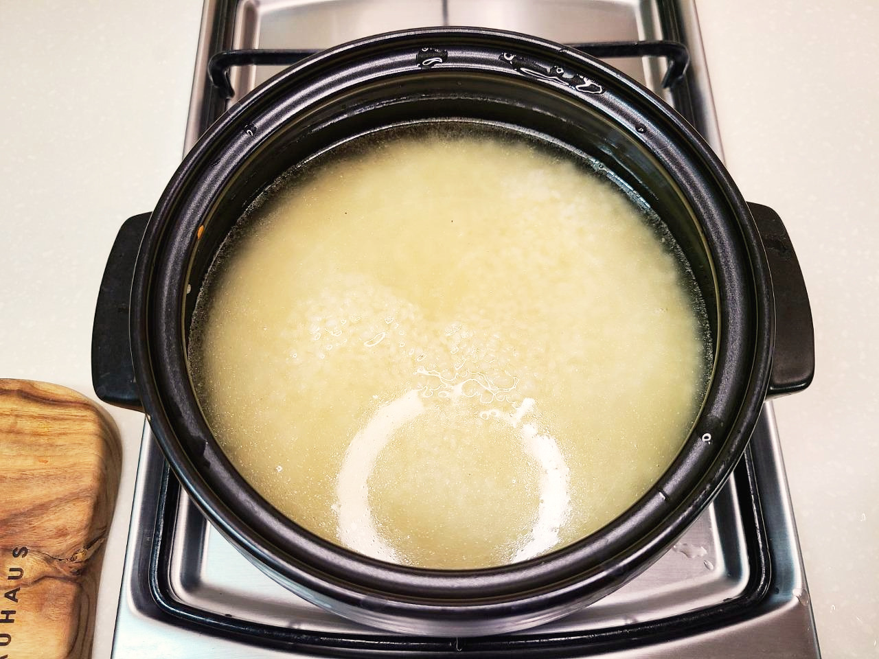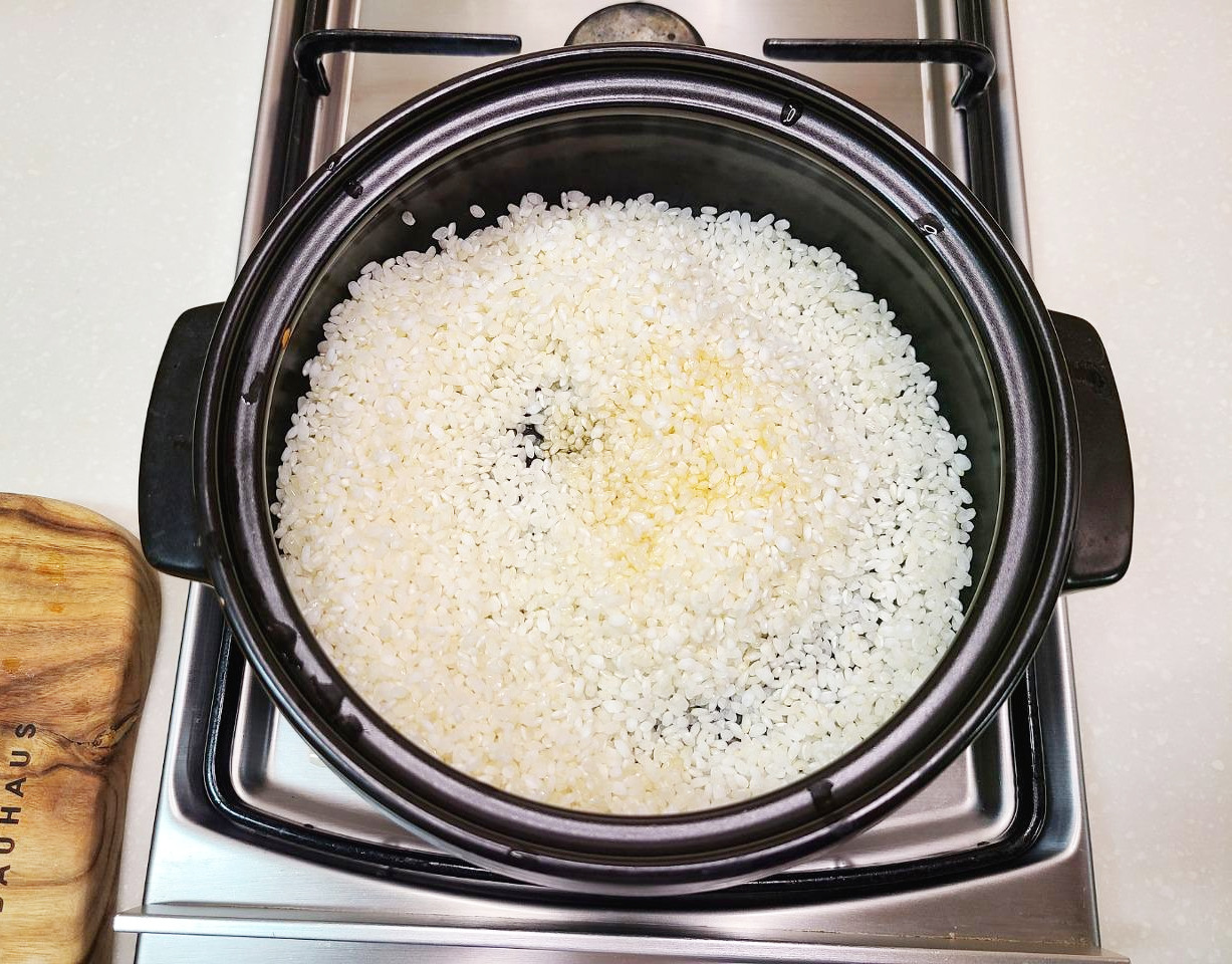 뚝배기를 은은하게 달군 다음 참기름 3/4T만 두르고 불린쌀을 볶아줍니다.