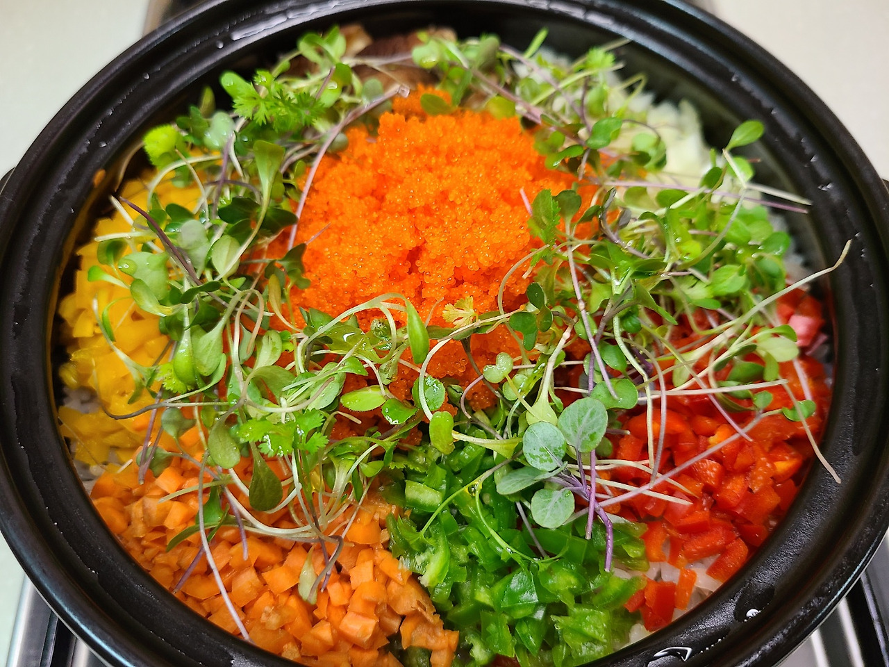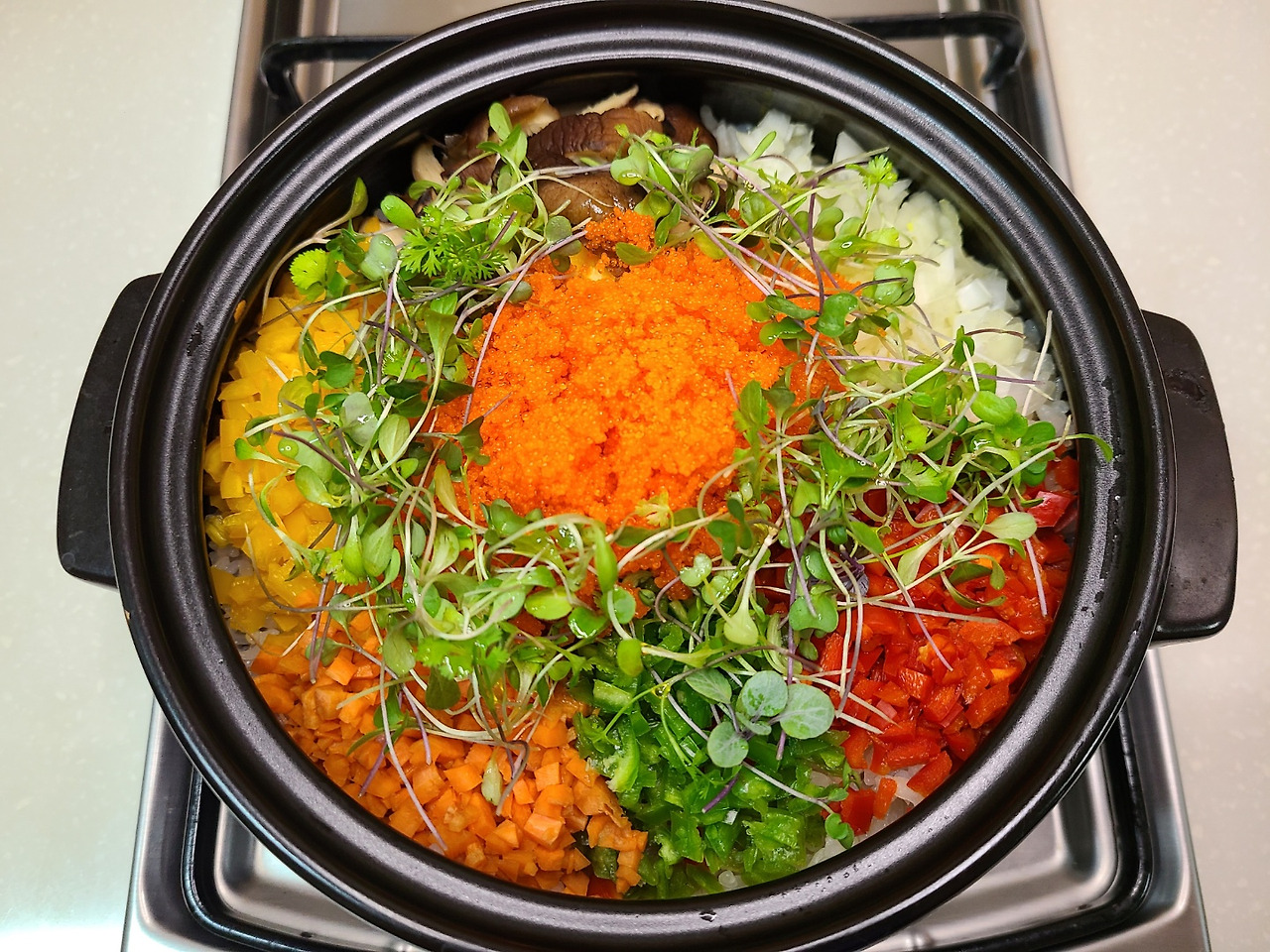 날치알을 올린 뒤 뚜껑을 덮고 5분간 뜸을 들여주세요.