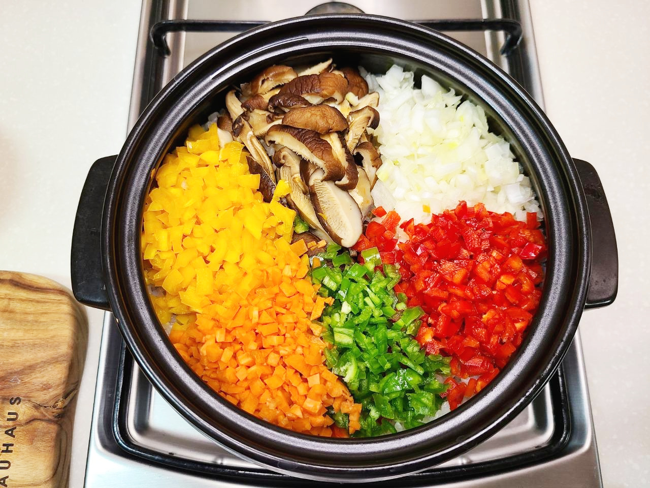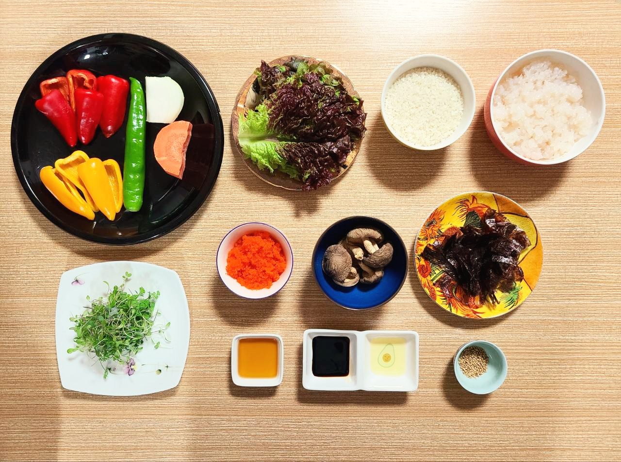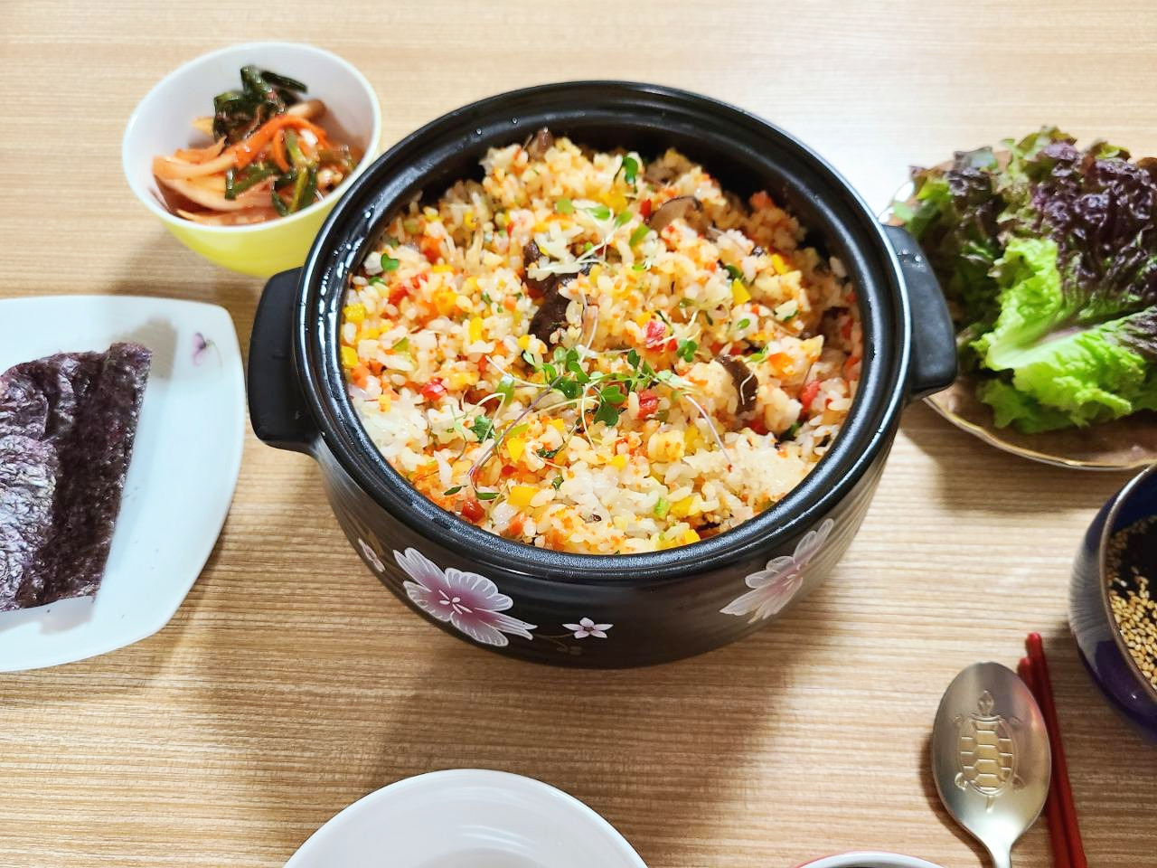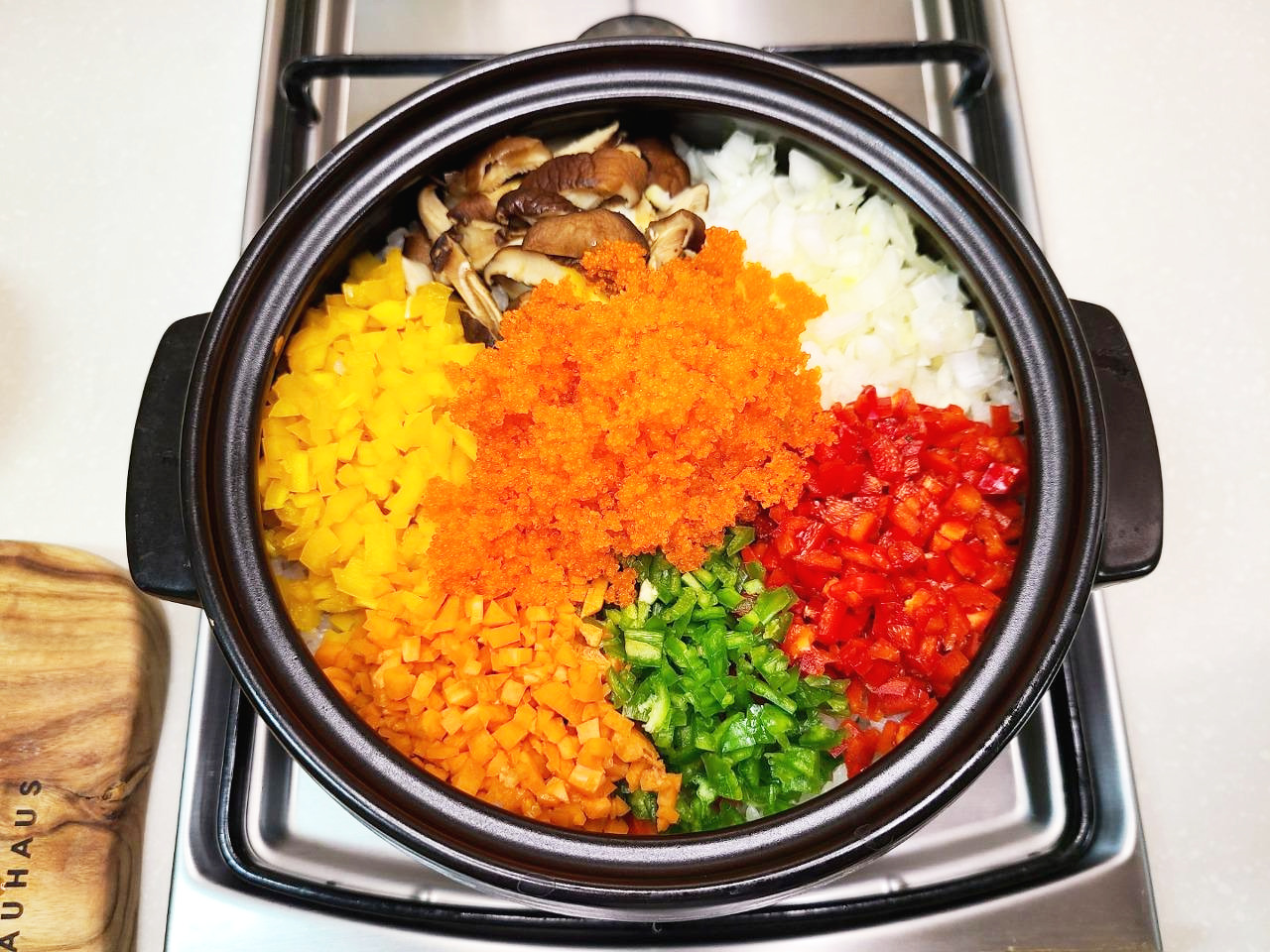 5인 기준으로 원래 쌀 5컵이 들어가지만 칼로리를 낮추기 위해 곤약쌀과 채소를 이용했어요. 곤약쌀 200g, 파프리카, 양파, 당근 등 몸에 좋은 채소를 듬뿍 넣어 포만감을 높이고 칼로리를 낮췄답니다. 단맛이 강한 단무지를 넣지 않고 대신 노란 파프리카를 넣었어요.