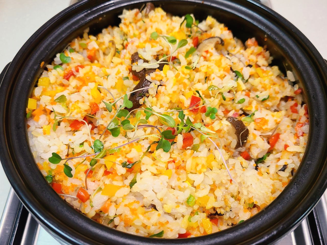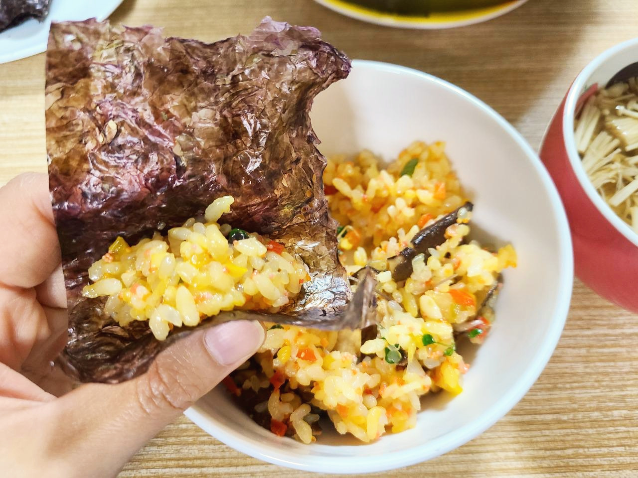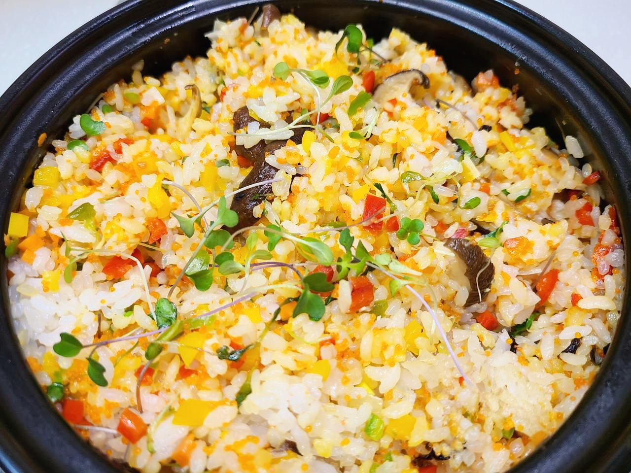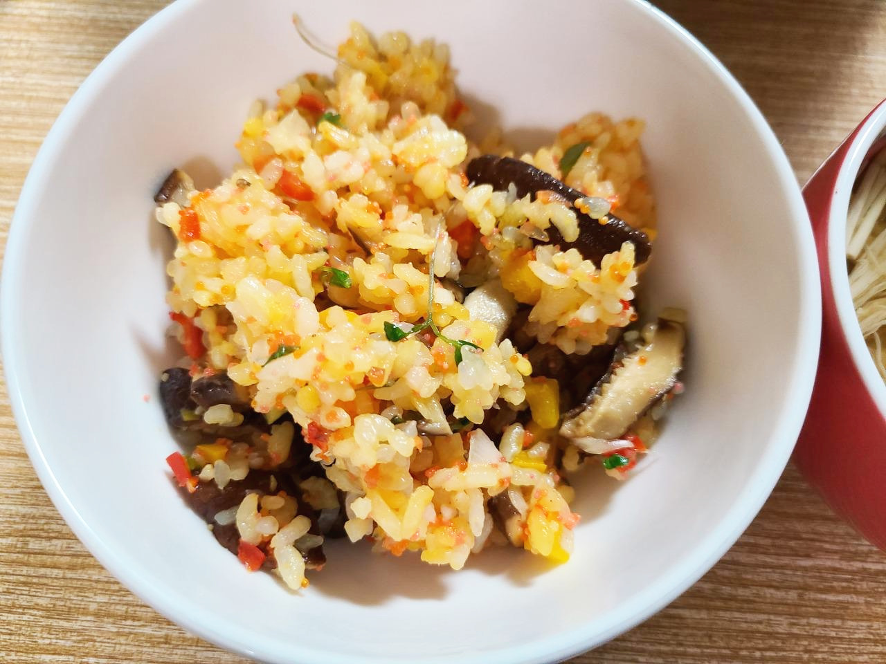 5인 기준으로 원래 쌀 5컵이 들어가지만 칼로리를 낮추기 위해 곤약쌀과 채소를 이용했어요. 곤약쌀 200g, 파프리카, 양파, 당근 등 몸에 좋은 채소를 듬뿍 넣어 포만감을 높이고 칼로리를 낮췄답니다. 단맛이 강한 단무지를 넣지 않고 대신 노란 파프리카를 넣었어요.