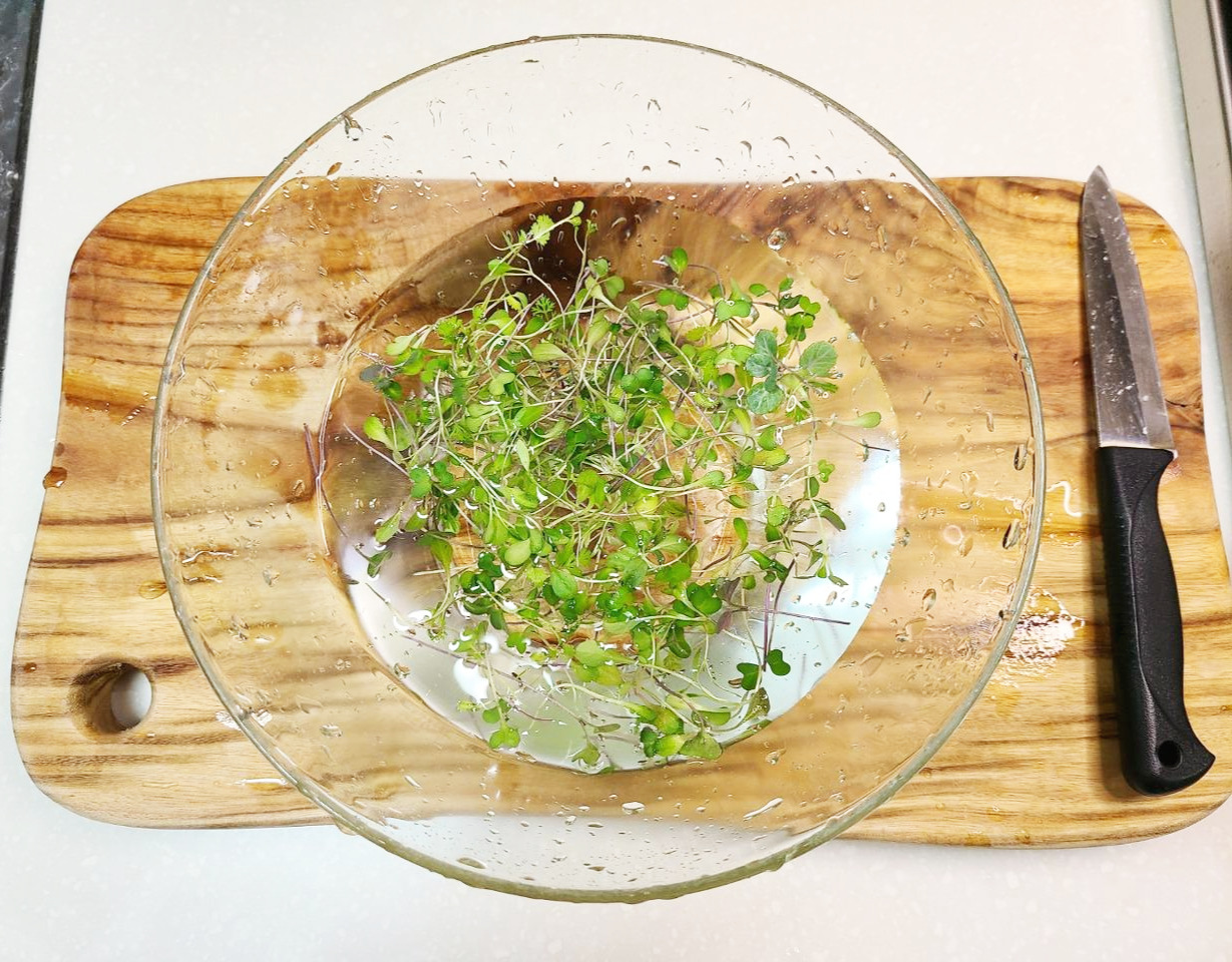 새싹채소는 살살 흐르는 찬물에 조심조심 씻은 다음 찬물에 담궈두세요.