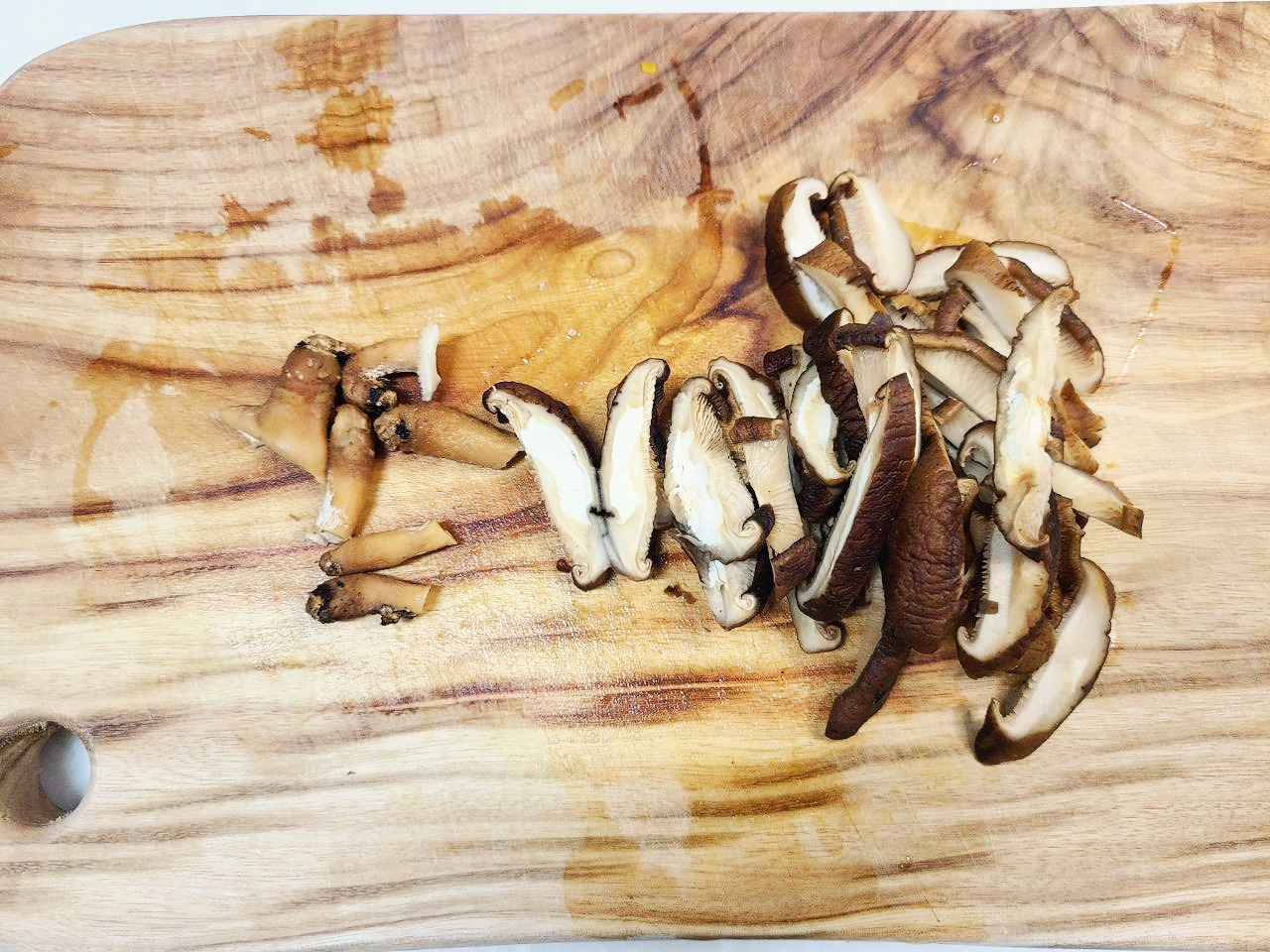 밥이 익는 동안 표고버섯을 손질한 뒤 뚜껑을 열어 한쪽에 가지런히 올려줍니다.