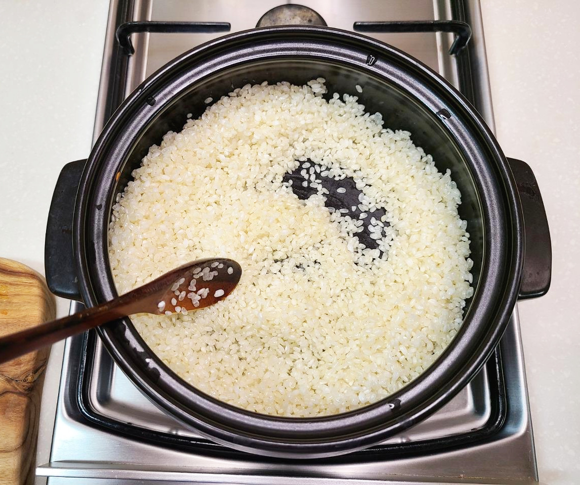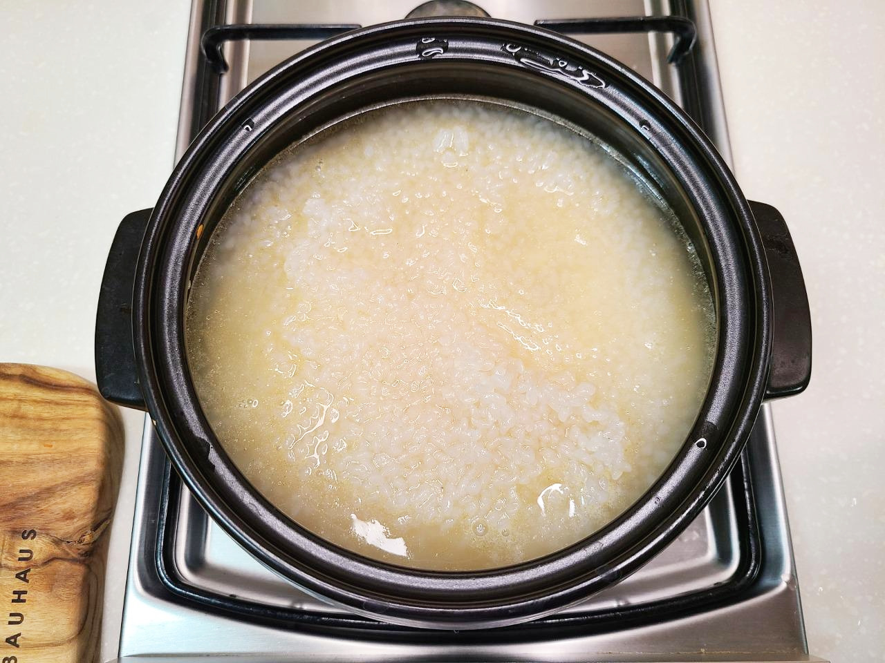쌀알이 약간 투명해지면서 고소한 냄새가 나면 표고버섯 우린 물 360ml를 붓고, 그 위에 곤약쌀을 넣어 줍니다.