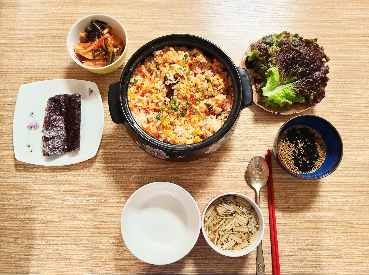 이렇게 했더니 1인당 280kcal, 보통 알밥은 1인분에 300~400kcal가 훌쩍 넘어가는데 다이어트 메뉴로 딱이죠? 어머님은 저염식을 하셔야해서 따로 간을 하거나 김치를 넣지 않고 양념장을 만들어서 조금씩 넣어드시게 했어요.