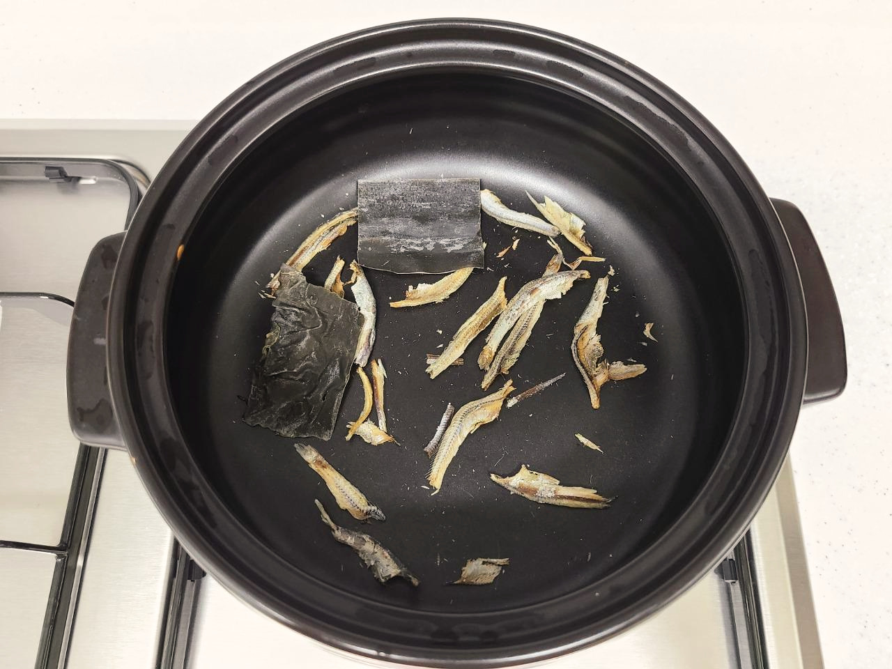 (마른 멸치와 다시마를 살짝 볶아야 국물맛도 좋아지고 비린내를 없앨 수 있어요.)