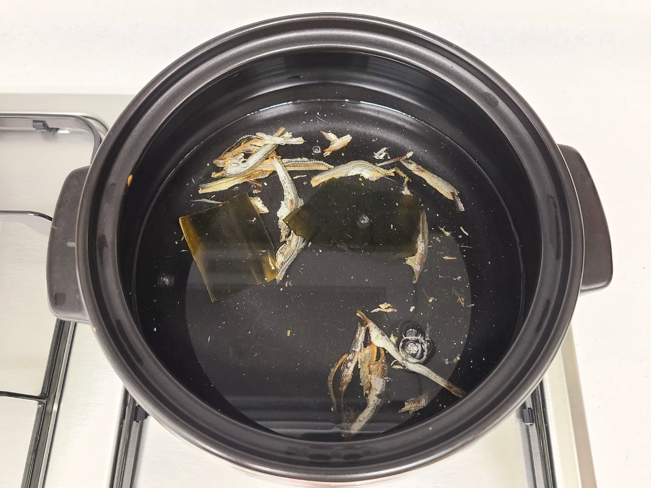 손질한 멸치를 넣어 볶다가 다시마도 살짝 볶아주세요. 고소한 냄새가 나면 물 400ml를 부어줍니다.