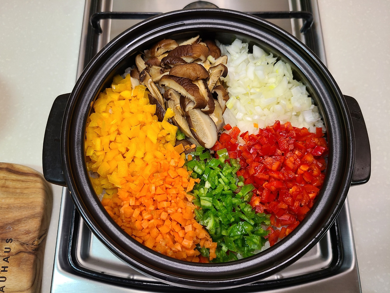 제가 쓰는 파프리카는 온라인에서 싸게 구매한 '못난이 파프리카'에요. 이렇게 잘게 썰어 놓으면 못난이도 예쁜이가 됩니다. 맛이나 영양소는 똑같구요. 당도가 떨어지는 세일 과일들은 주스용으로 갈아서 마시면 정말 좋습니다.