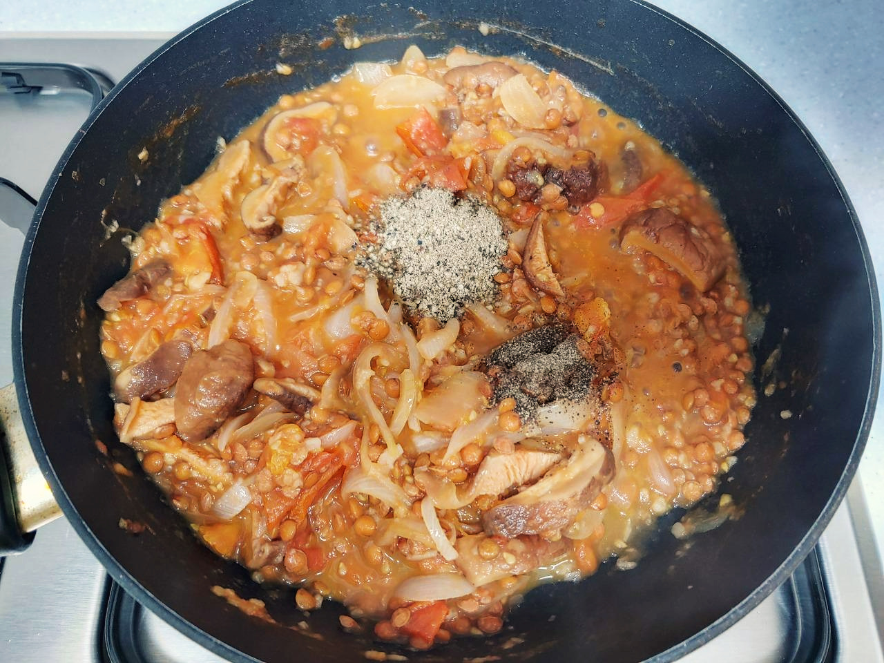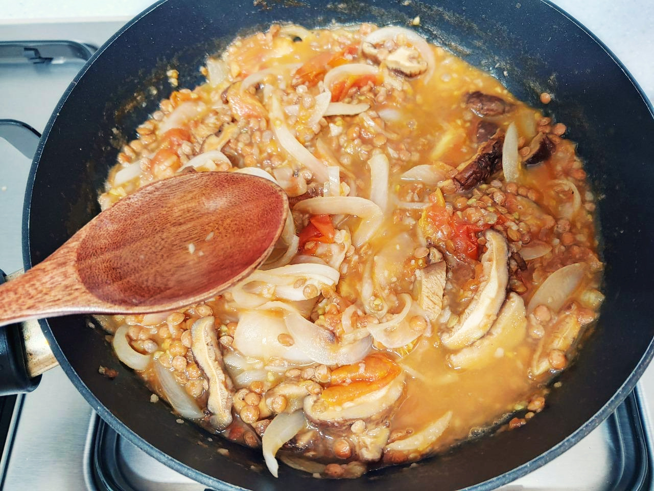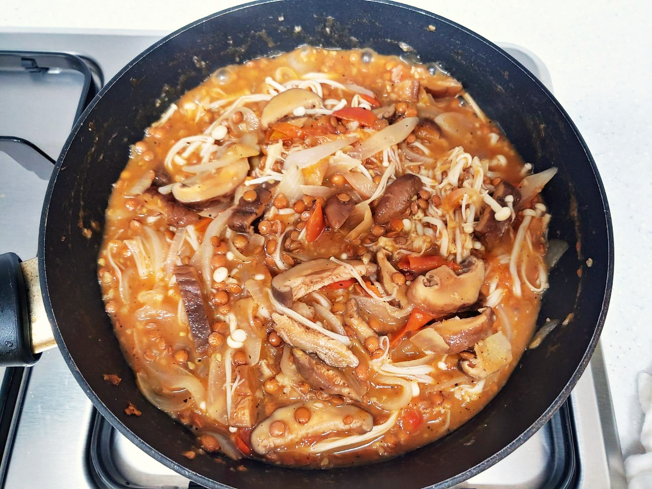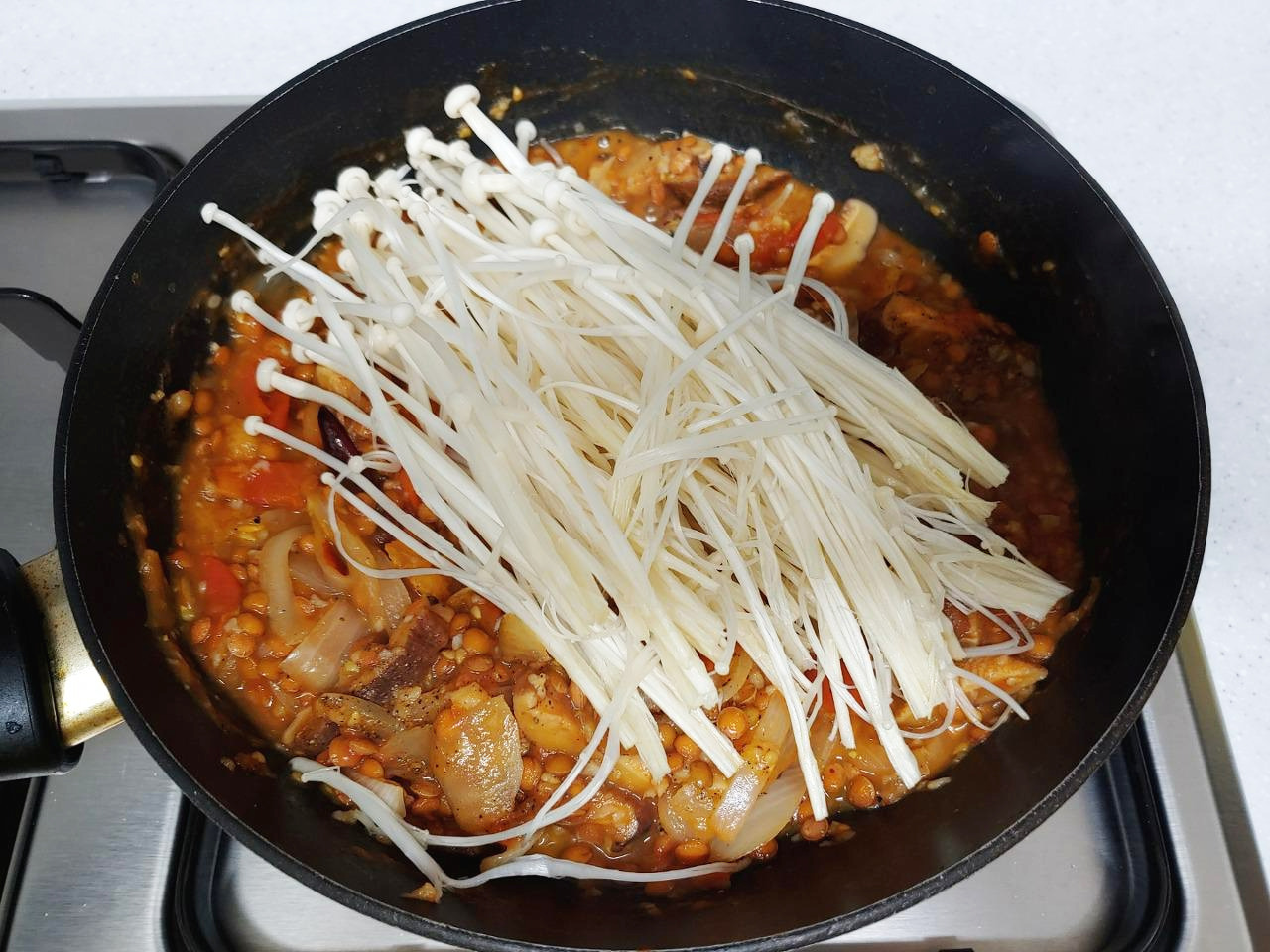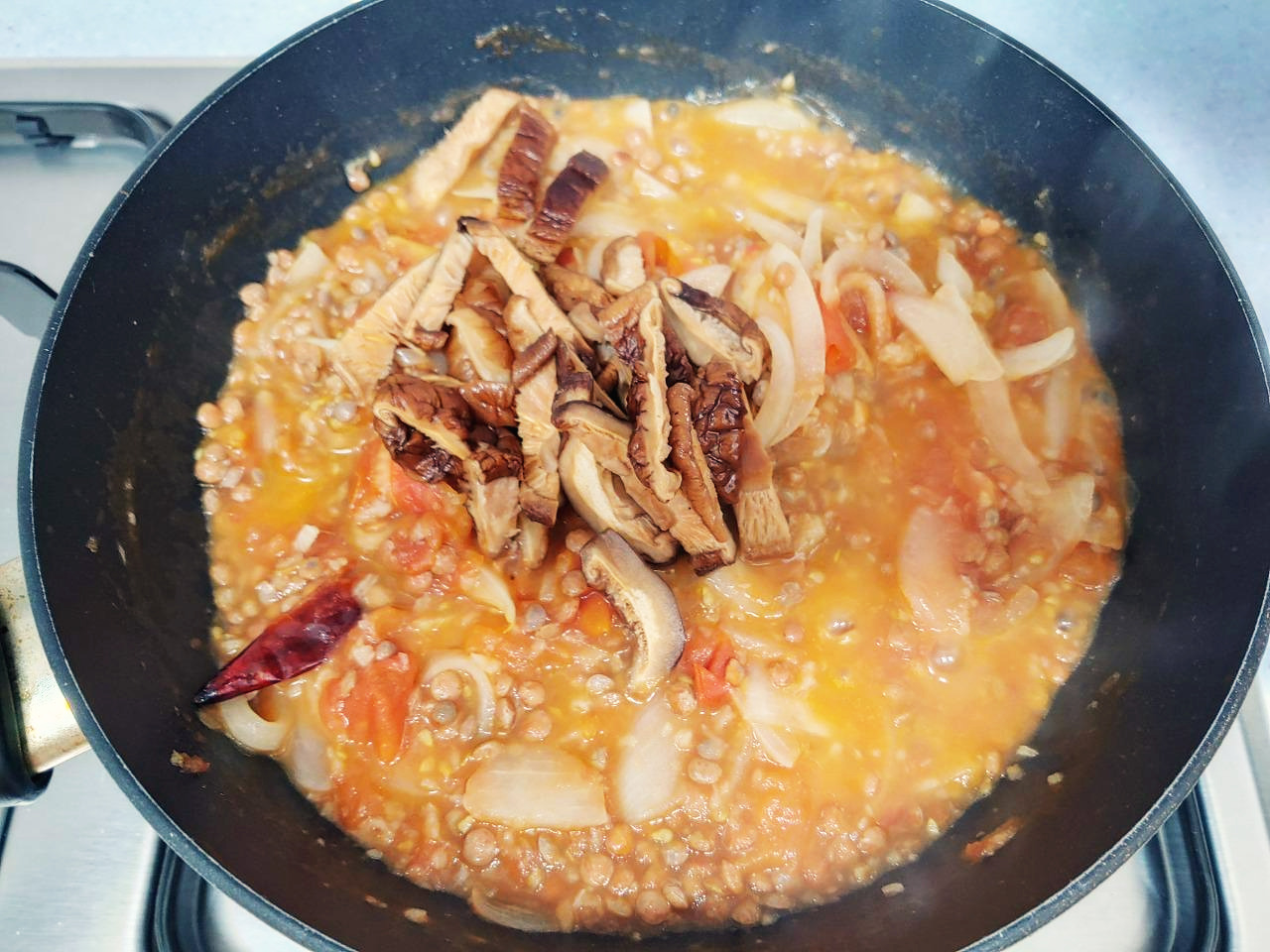 양파가 익으면 렌틸콩을 넣고 잘 익혀줍니다. 중불에서 5~10분 정도 푹 익힌다음 표고버섯을 넣어주세요.