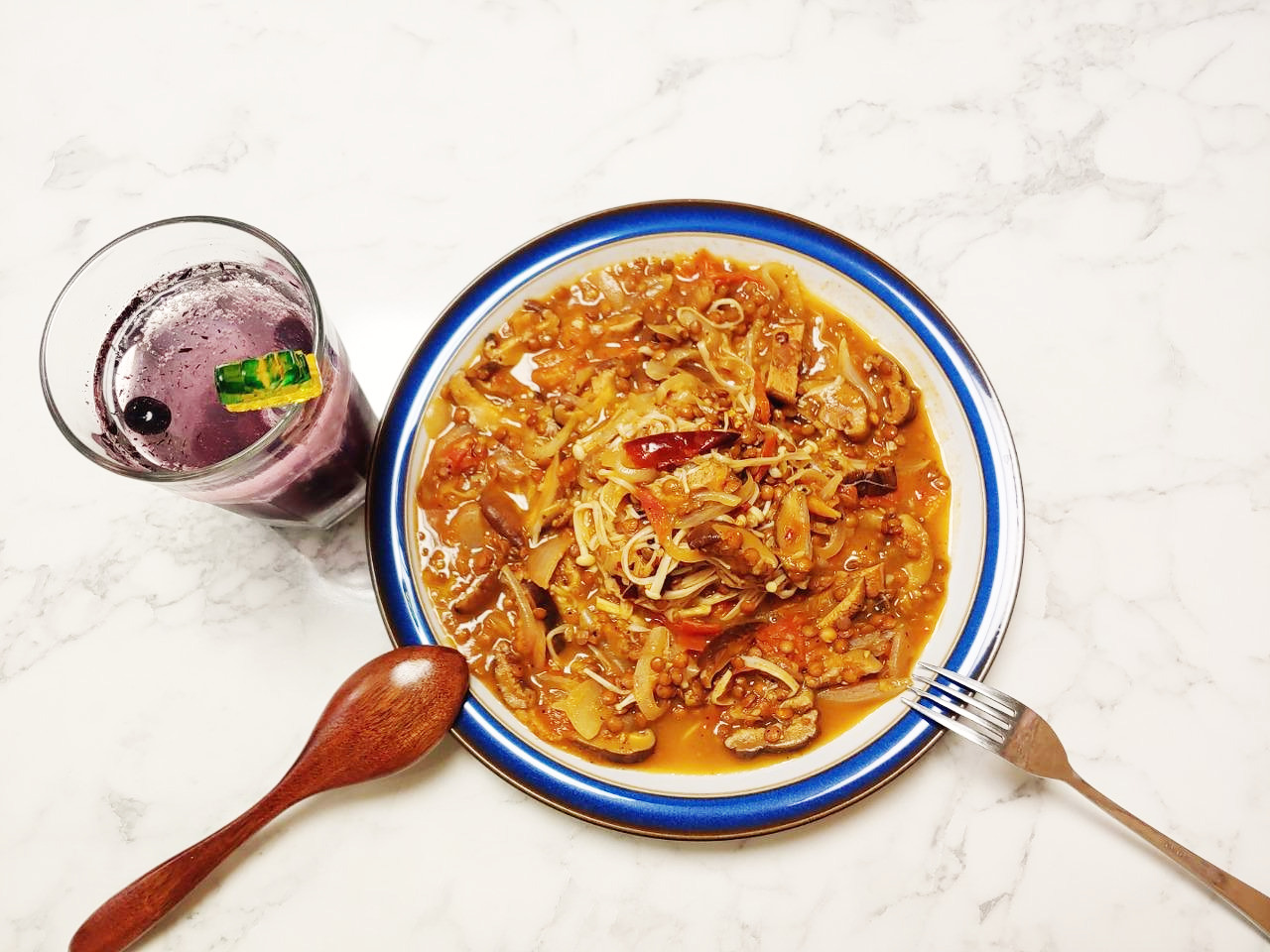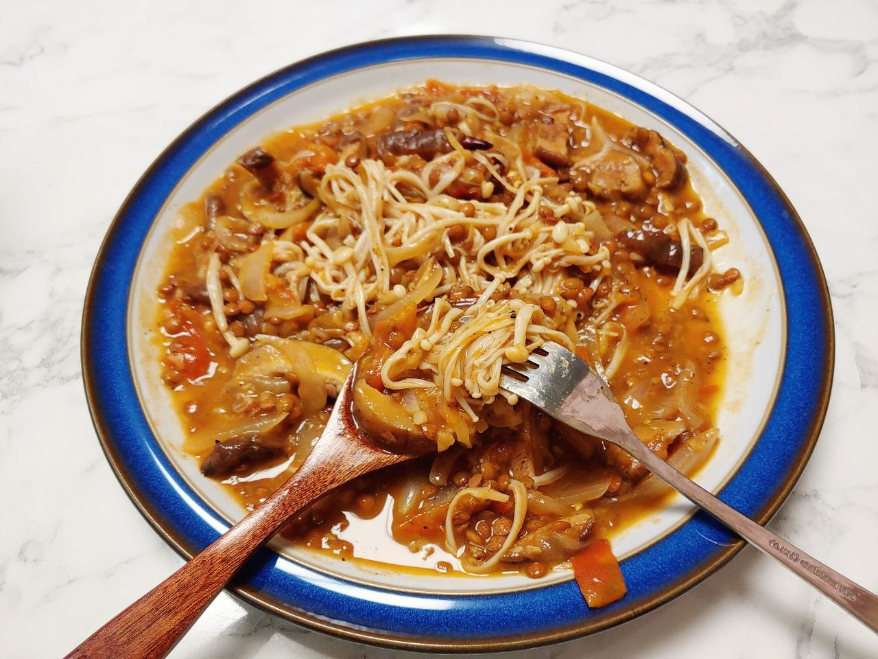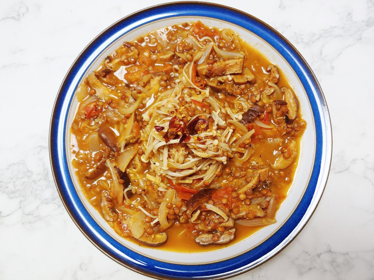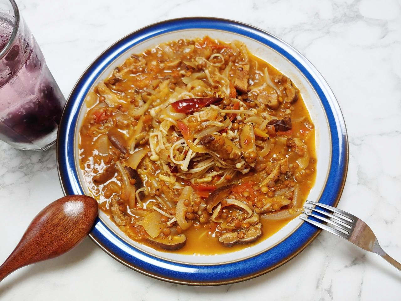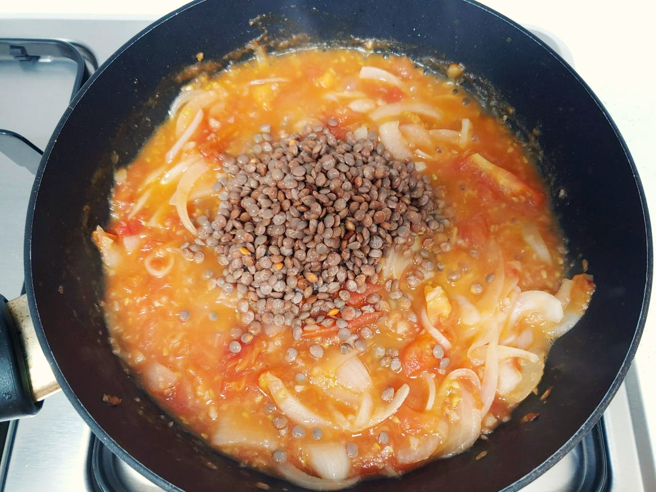 양파가 익으면 렌틸콩을 넣고 잘 익혀줍니다. 중불에서 5~10분 정도 푹 익힌다음 표고버섯을 넣어주세요.