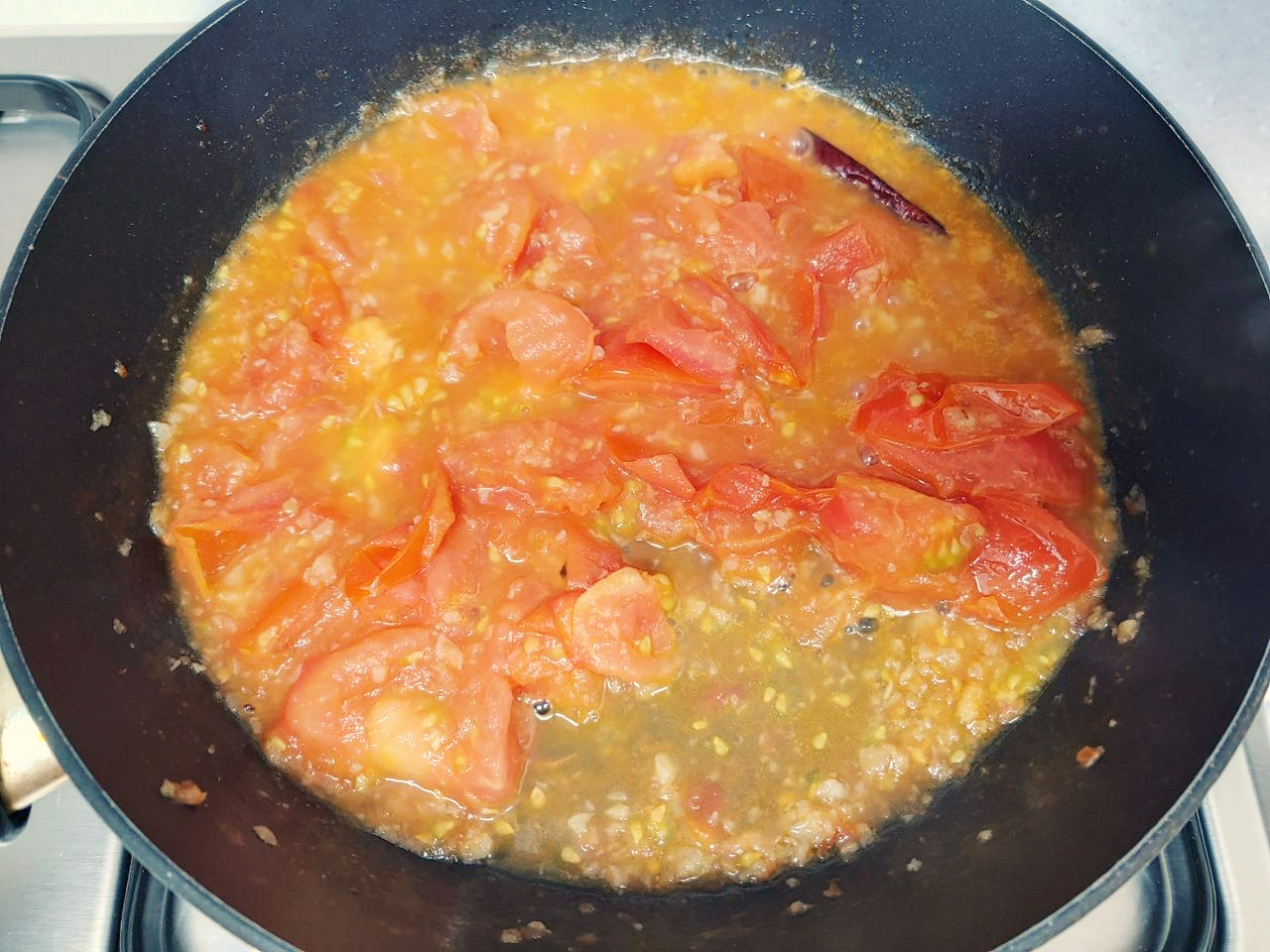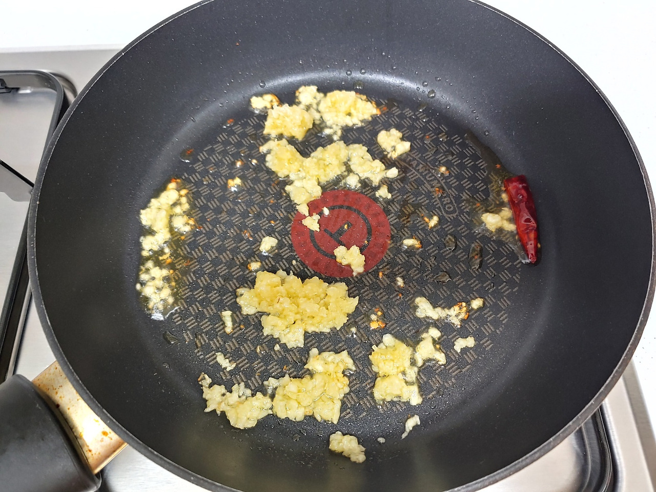 팬에 올리브유를 두른다음 간마늘과 태국고추를 볶아주세요. 마늘이 튀겨지 듯 볶아지면 토마토를 넣어 뭉개 듯 익혀줍니다.