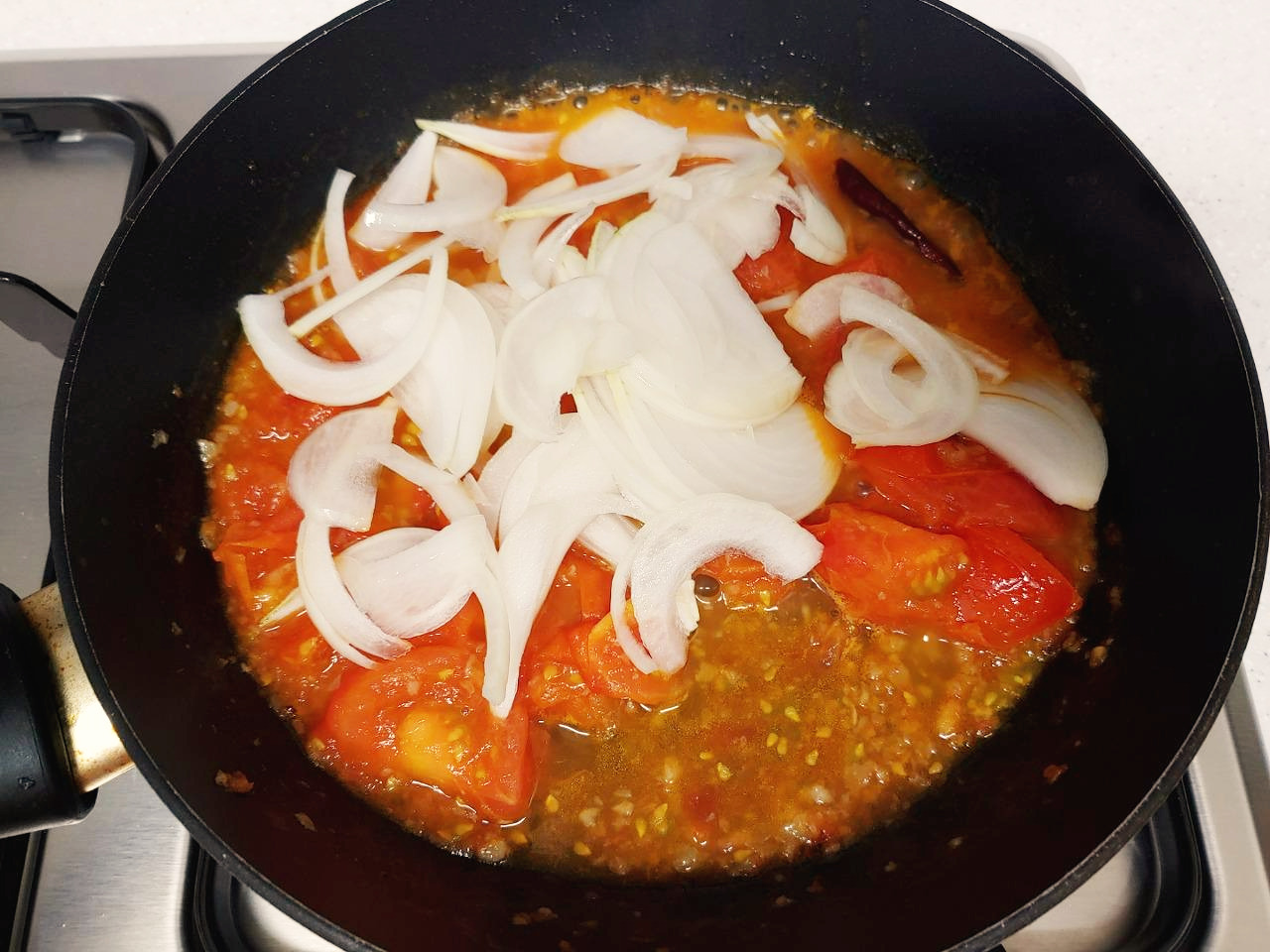 토마토가 소스처럼 뭉개지면 양파를 얇게 썰어 같이 볶아주세요.