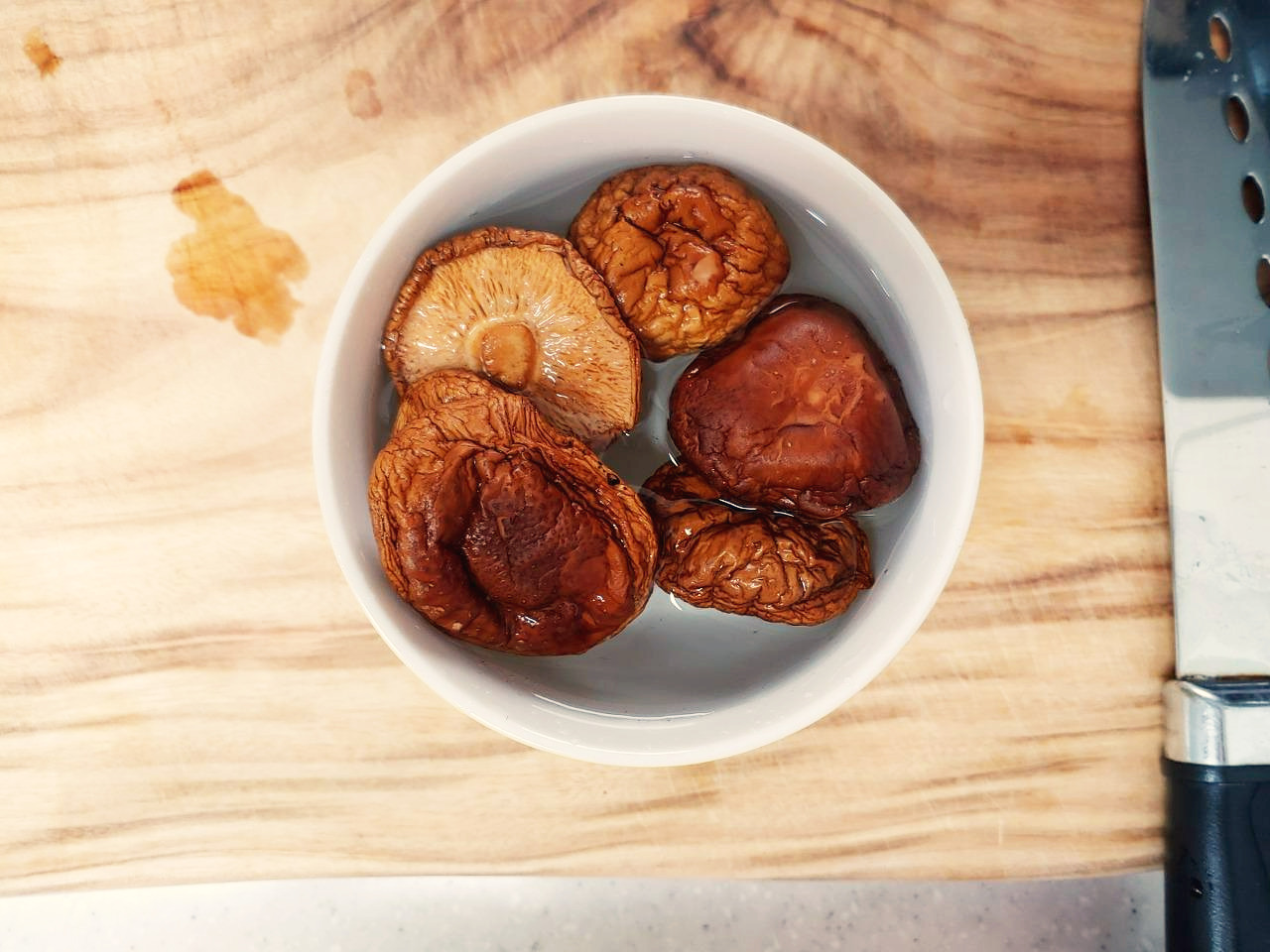 건표고는 물에 충분히 불려주시고 팽이버섯은 씻으면서 쪽쪽 찢어주세요.