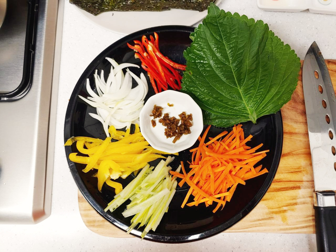깻잎 위에 손질한 채소들을 가지런히 올려주세요.