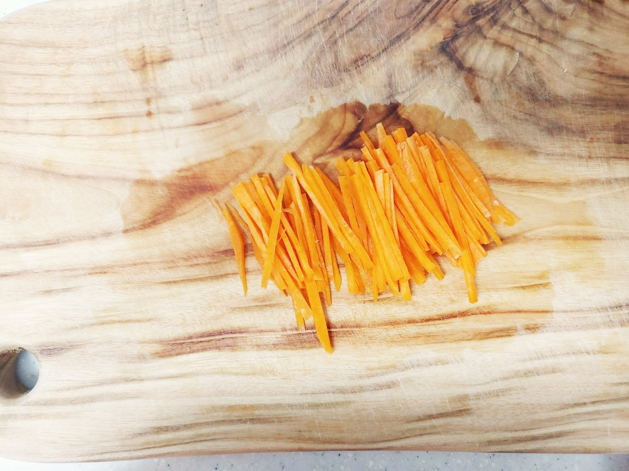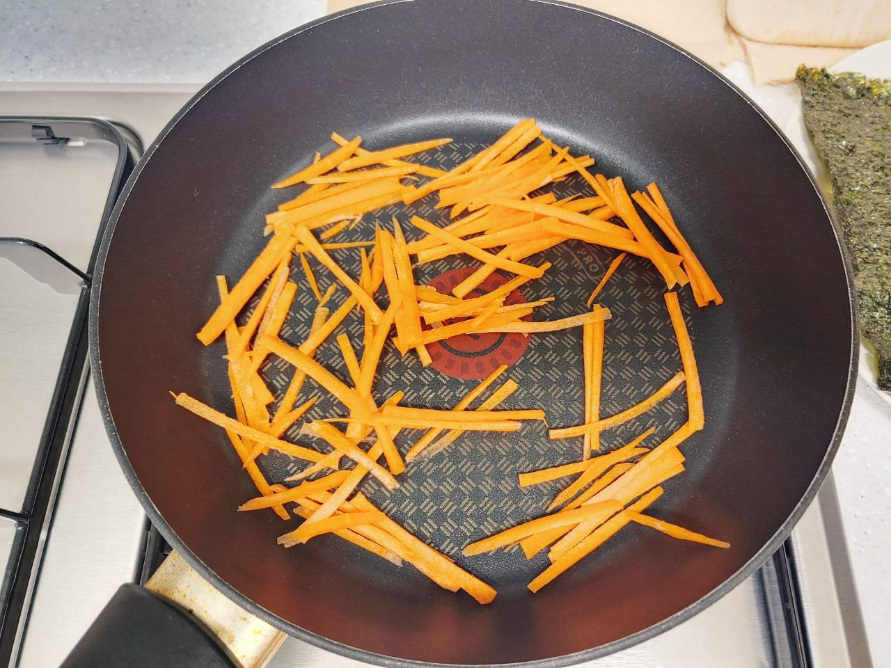 당근은 채썬 뒤 프라이팬에 기름을 두르지 않고 한번 볶아주세요.
