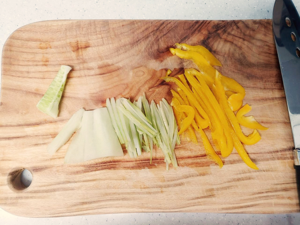 밥이 될 동안 채소를 손질해줍니다. 오이는 돌려깎기 한 다음 씨를 제외한 나머지 부분을 얇게 썰어주세요. 파프리카는 단무지처럼 굵직하게 썰어줍니다. 양파, 홍고추는 얇게 채썰어주세요.