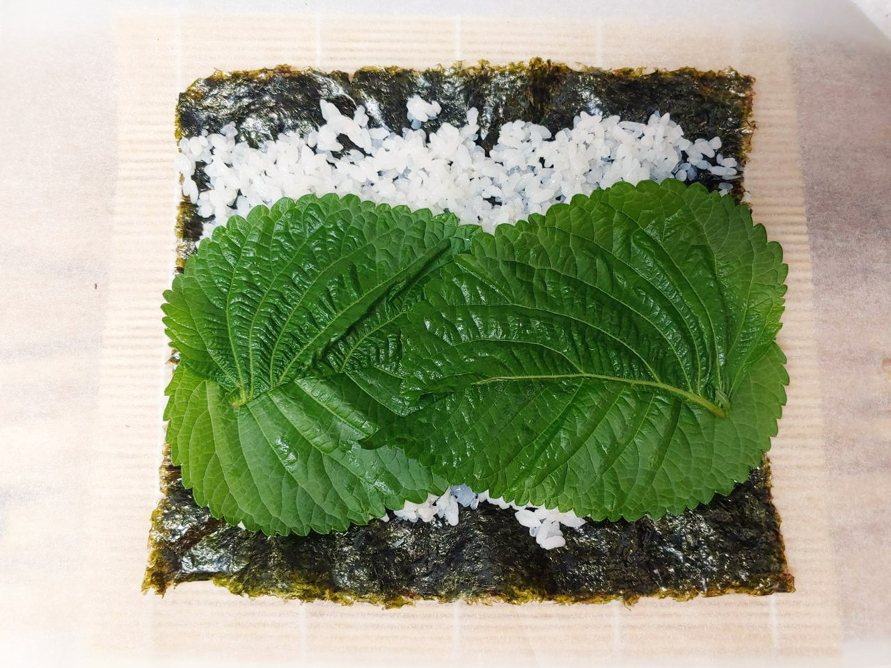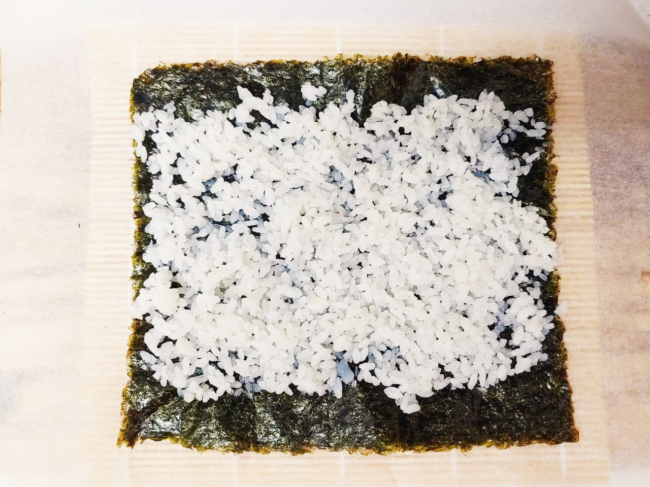 김발에 종이호일을 깔고, 김을 올려주세요. 그 위에 곤약밥을 골고루 펴줍니다.