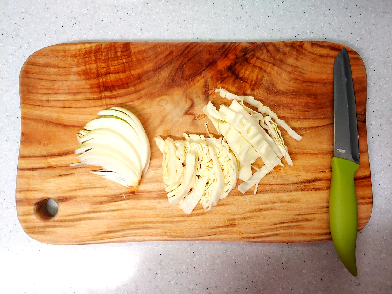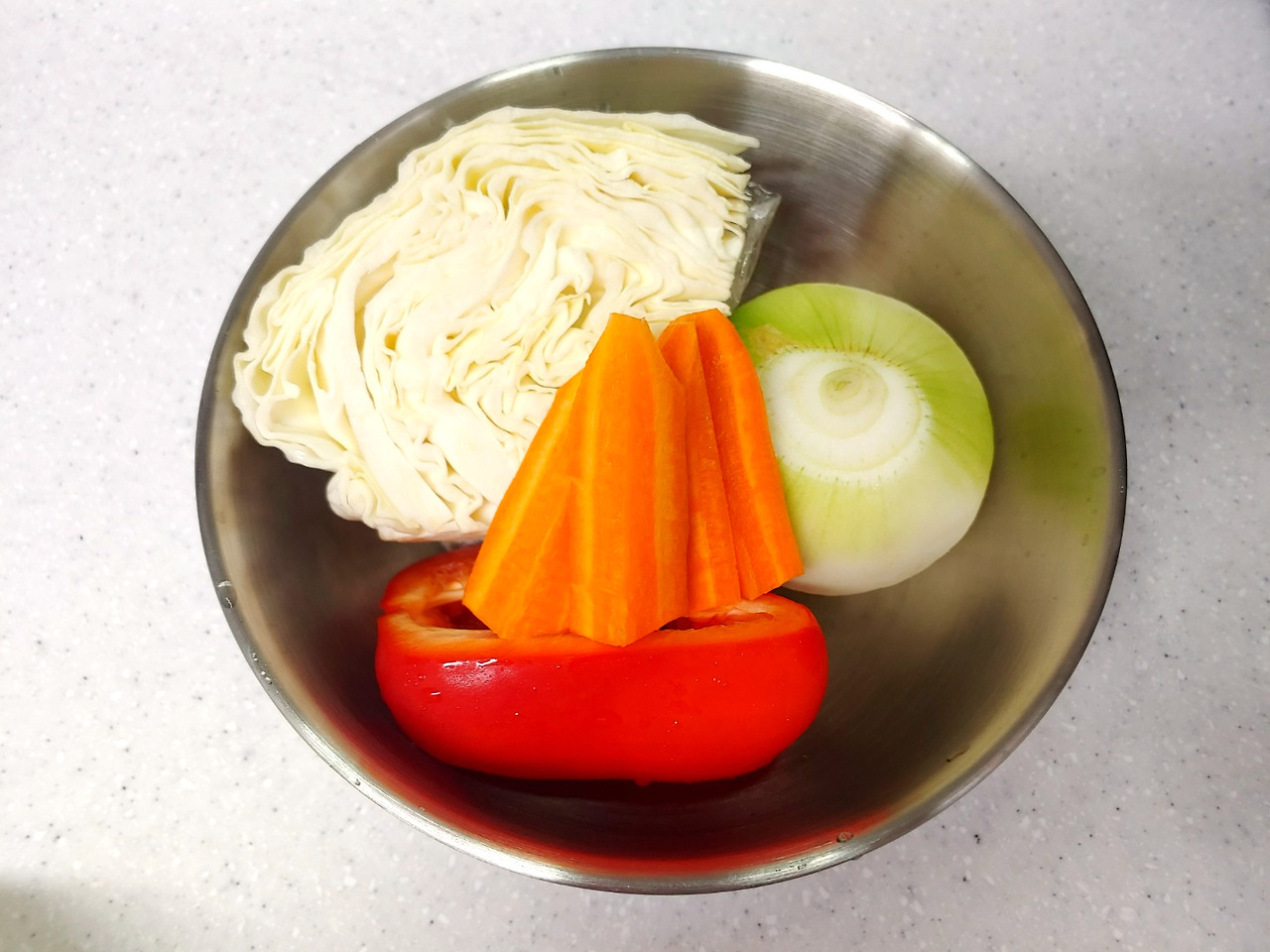 양파와 양배추는 1cm 너비로 잘라주세요. 파프리카와 당근도 비슷한 크기로 썰어 줍니다.