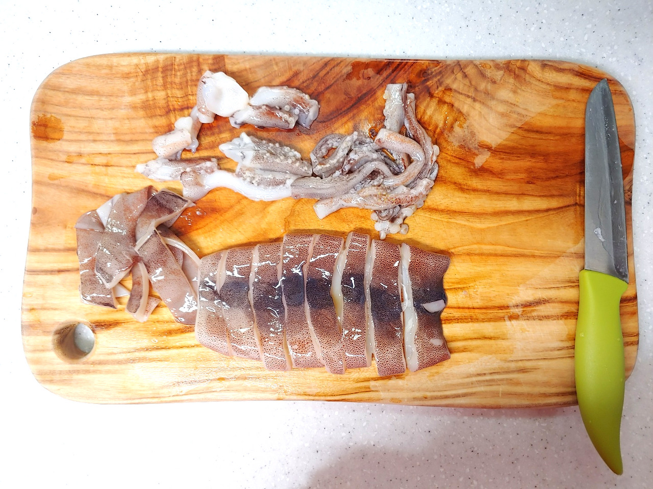 손질 오징어는 찬물에 씻은 다음 먹기 좋은 크기로 썰어주세요. 다리는 5cm 길이로, 몸통은 1cm 너비로 잘라줍니다.