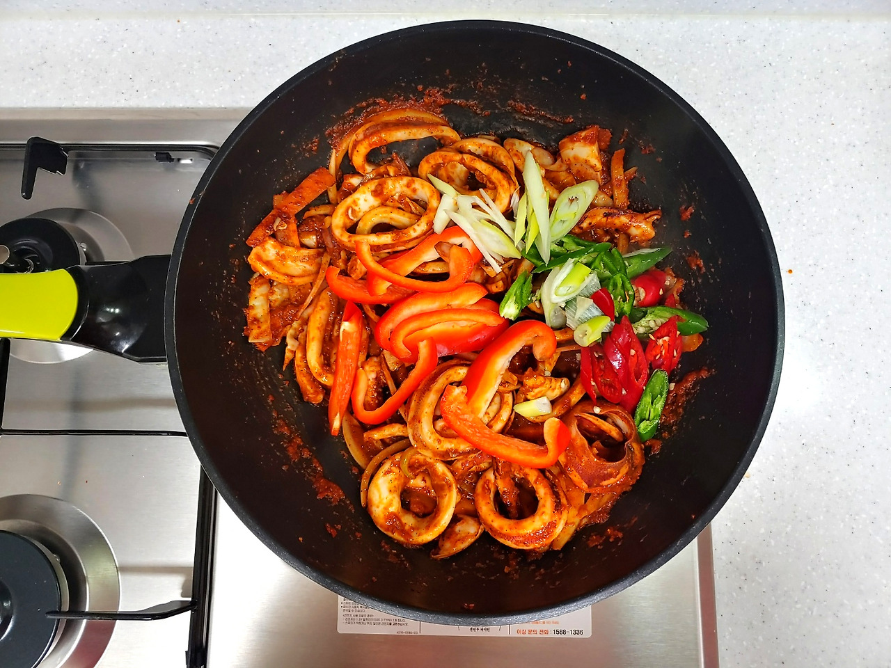 양념장이 재료들과 잘 볶아지면 파프리카, 파, 홍고추, 청고추를 썰어 넣고 휘리릭 볶아주세요. 마지막으로 불을 끄고 올리고당, 참기름, 깻잎을 넣은 뒤 한번 뒤적거려주세요.
