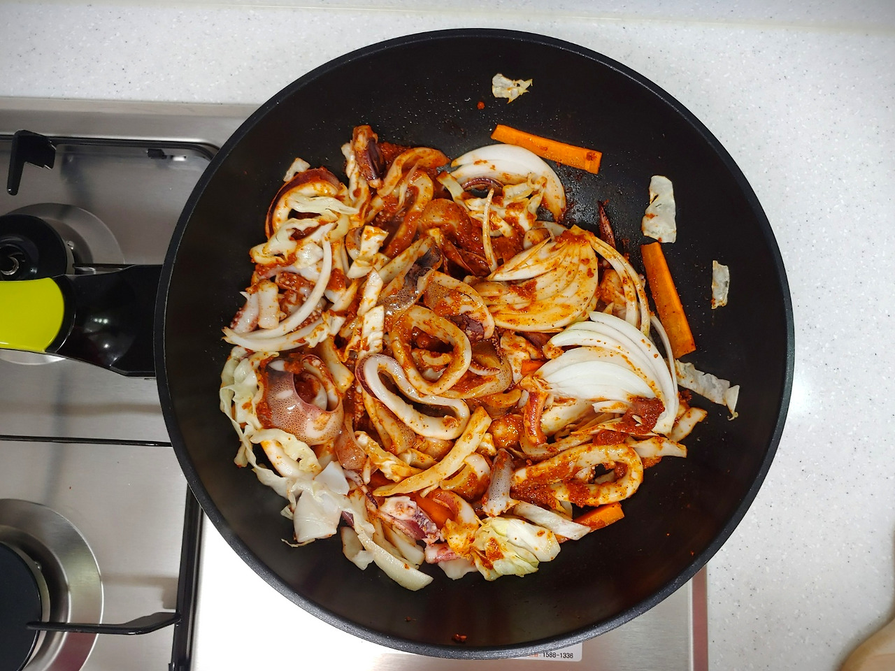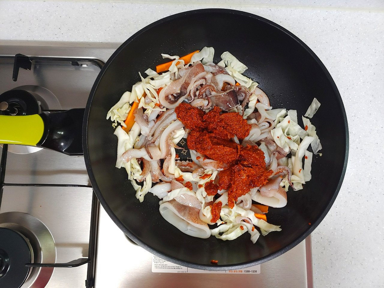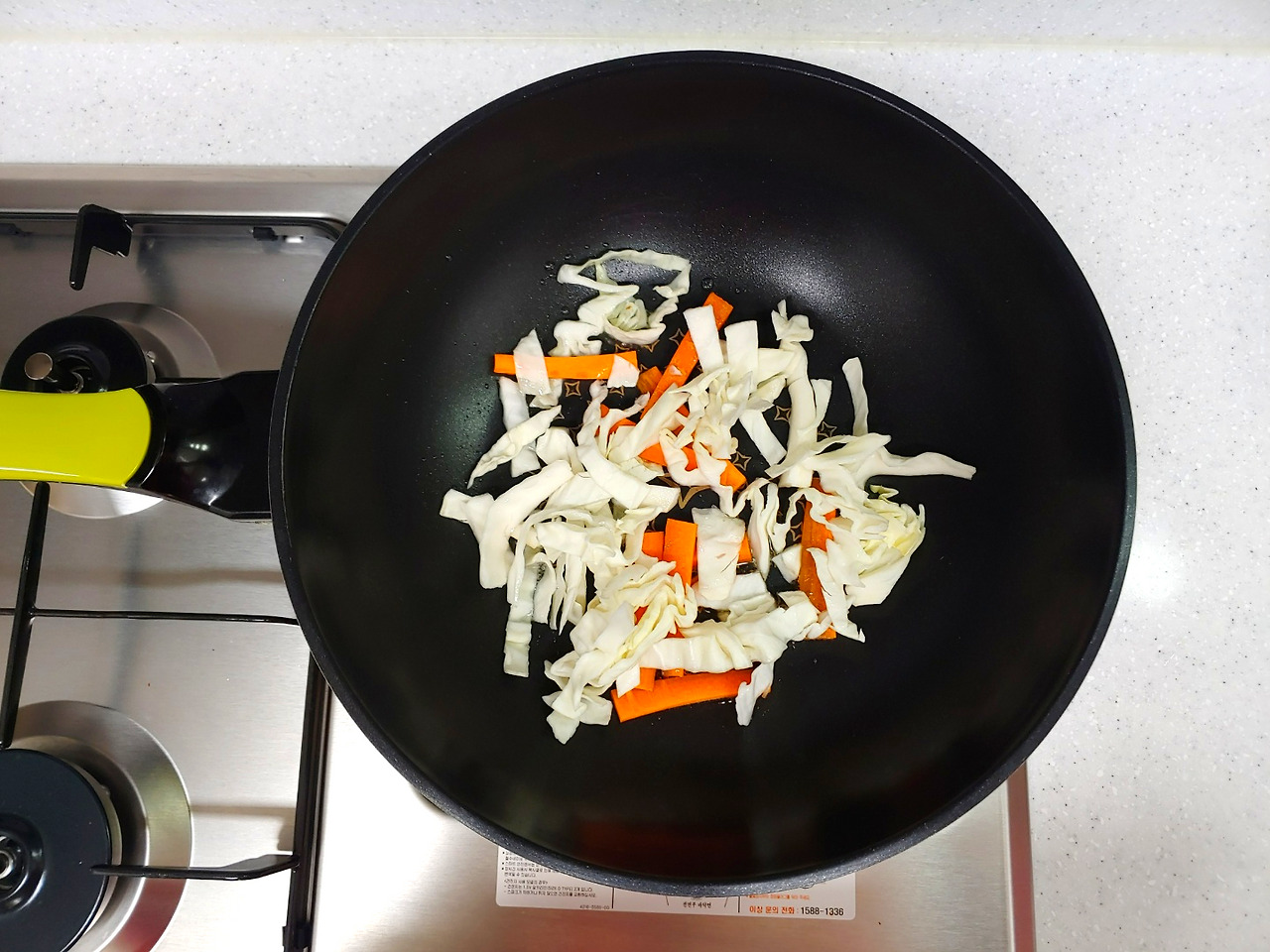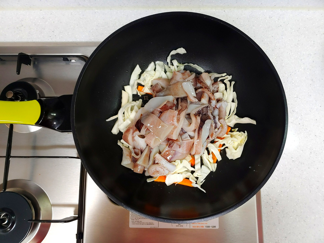 팬에 식용유 1T를 두르고 당근, 양배추, 오징어를 넣어 겉면만 살짝 볶아주세요.