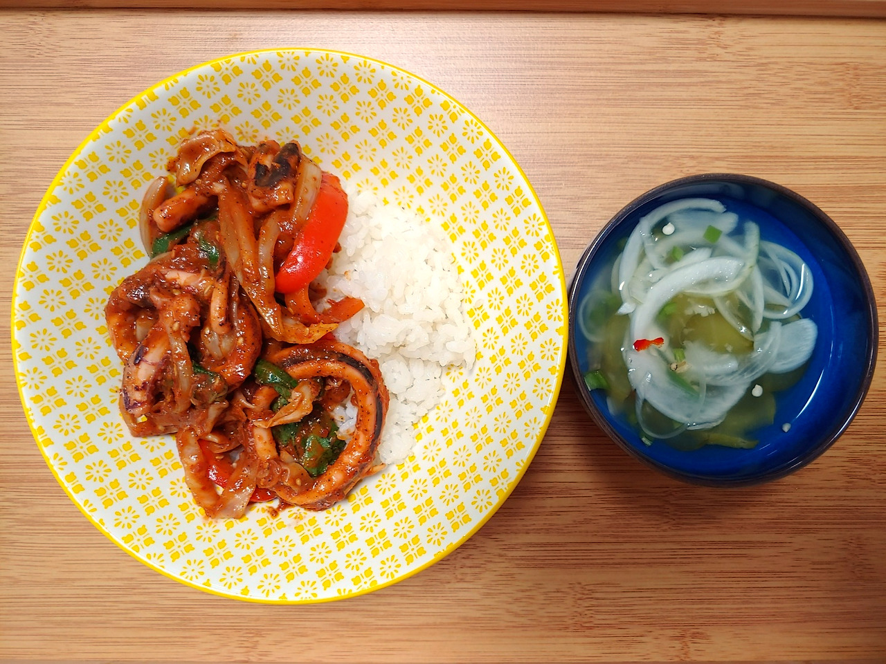 오징어볶음 올린 곤약밥과 저염 물오이지 냉국.