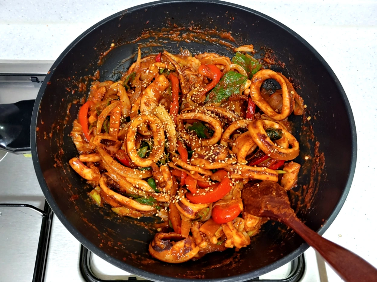(너무 오래 볶으면 오징어가 질겨지기 때문에 강불에서 빠르게 볶아냅니다.)
