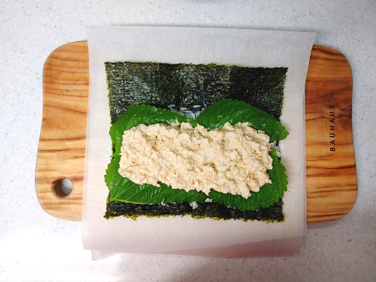 김 위에 밥을 얇게 펴바른 뒤 깻잎을 올리고 마요네즈에 버무린 참치를 올려줍니다.