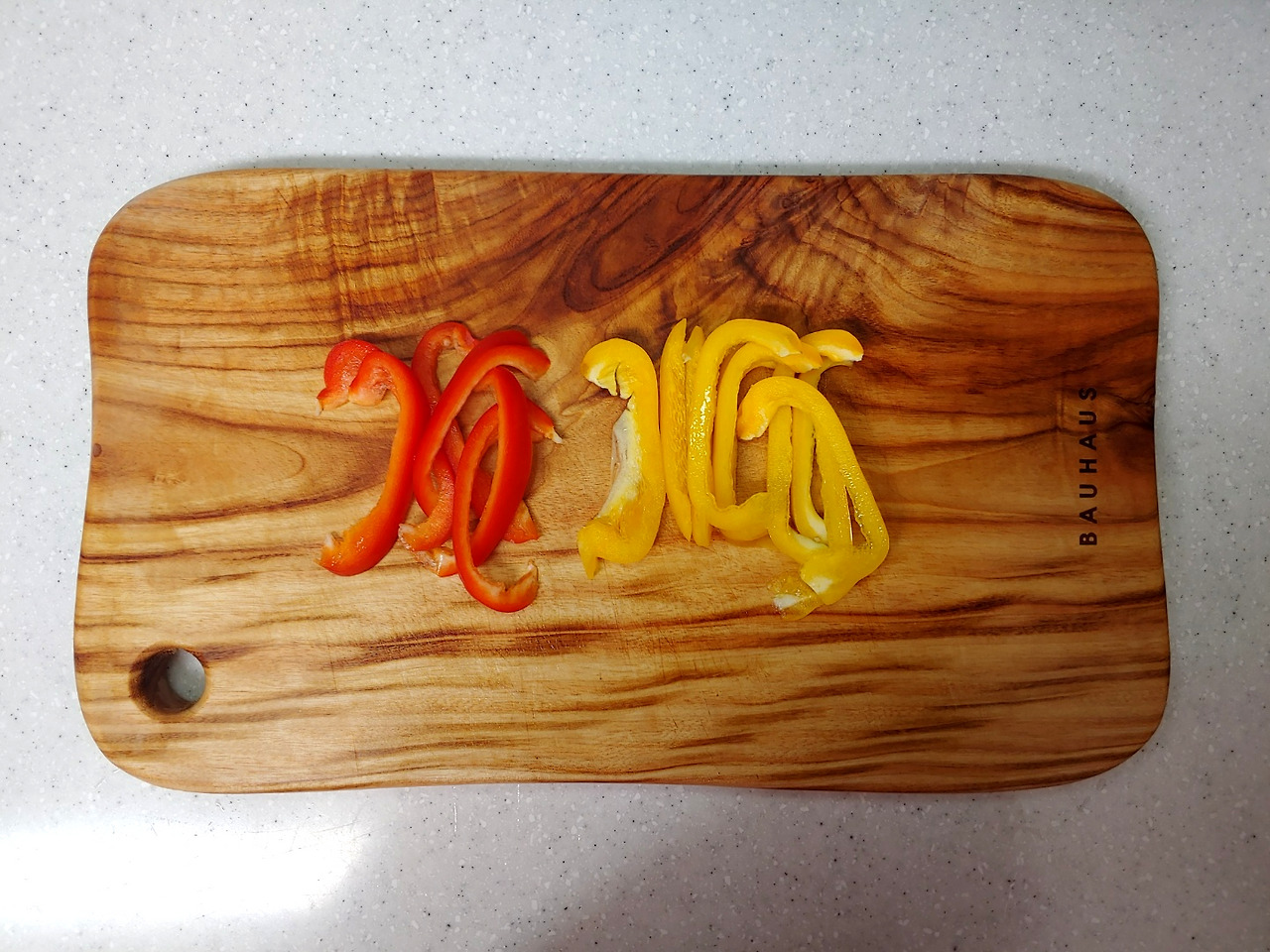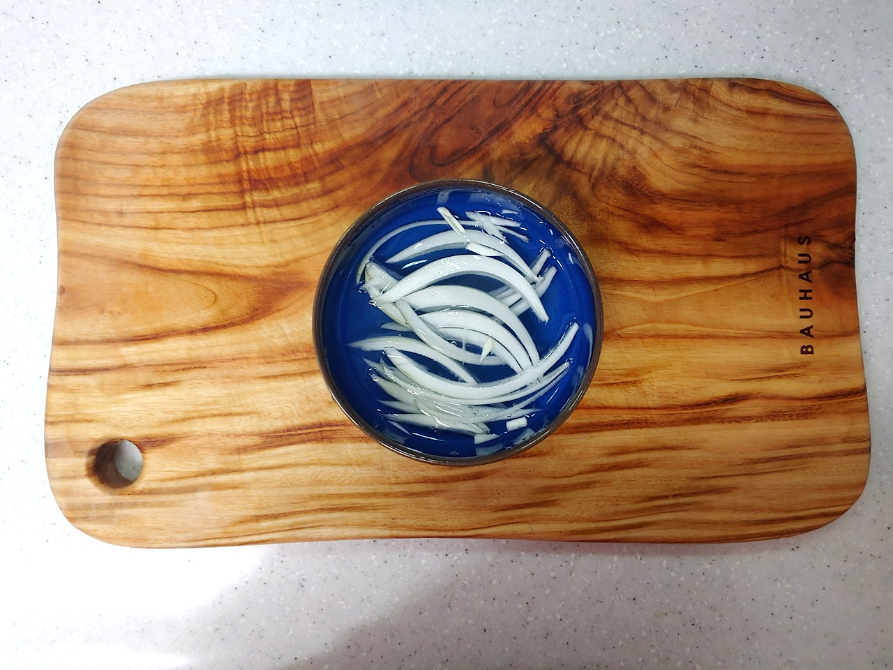 양파는 얇게 채썰어 식촛물에 담가 놓고 파프리카는 0.5cm 너비로 길쭉하게 잘라줍니다.