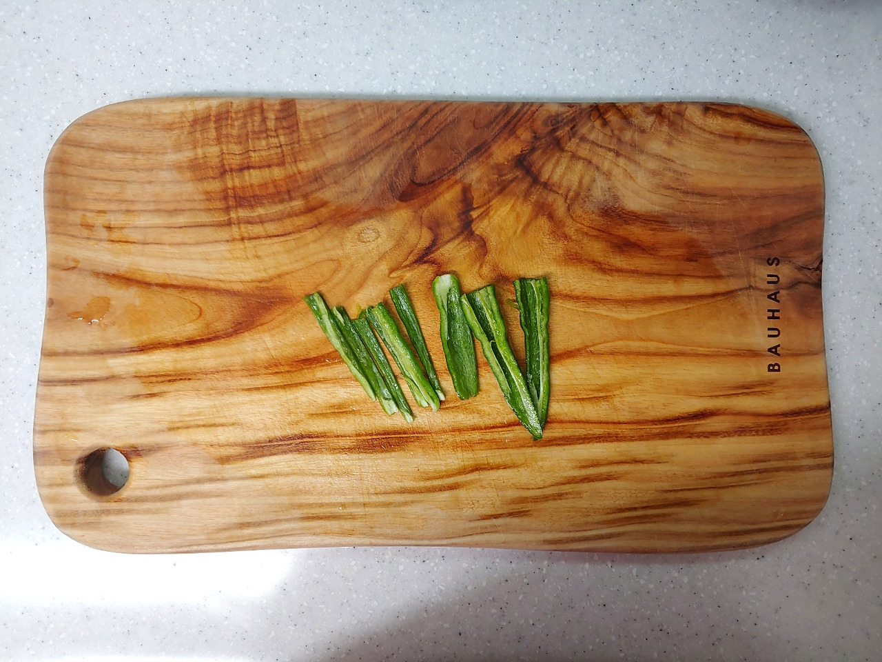 오이는 가운데 심을 제거한 다음 길쭉하게 잘라주고 청양고추도 가운데 심과 씨를 제거한 뒤 길쭉하게 썰어주세요.