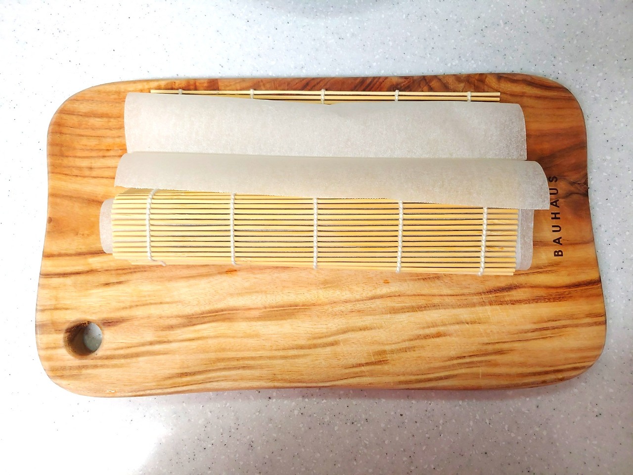 다른 부재료들을 색색깔별로 올려놓고 김발로 잘 말아줍니다.