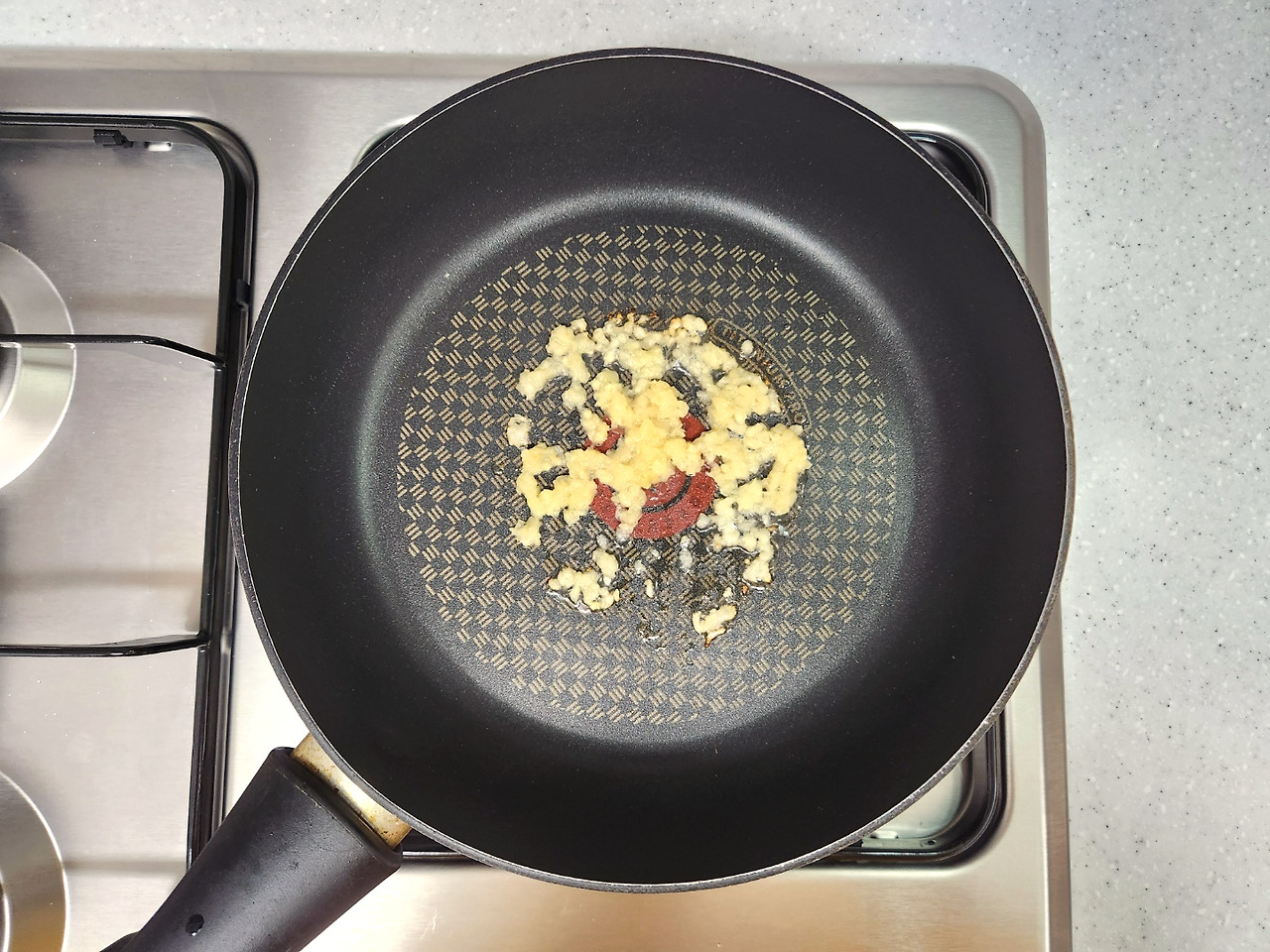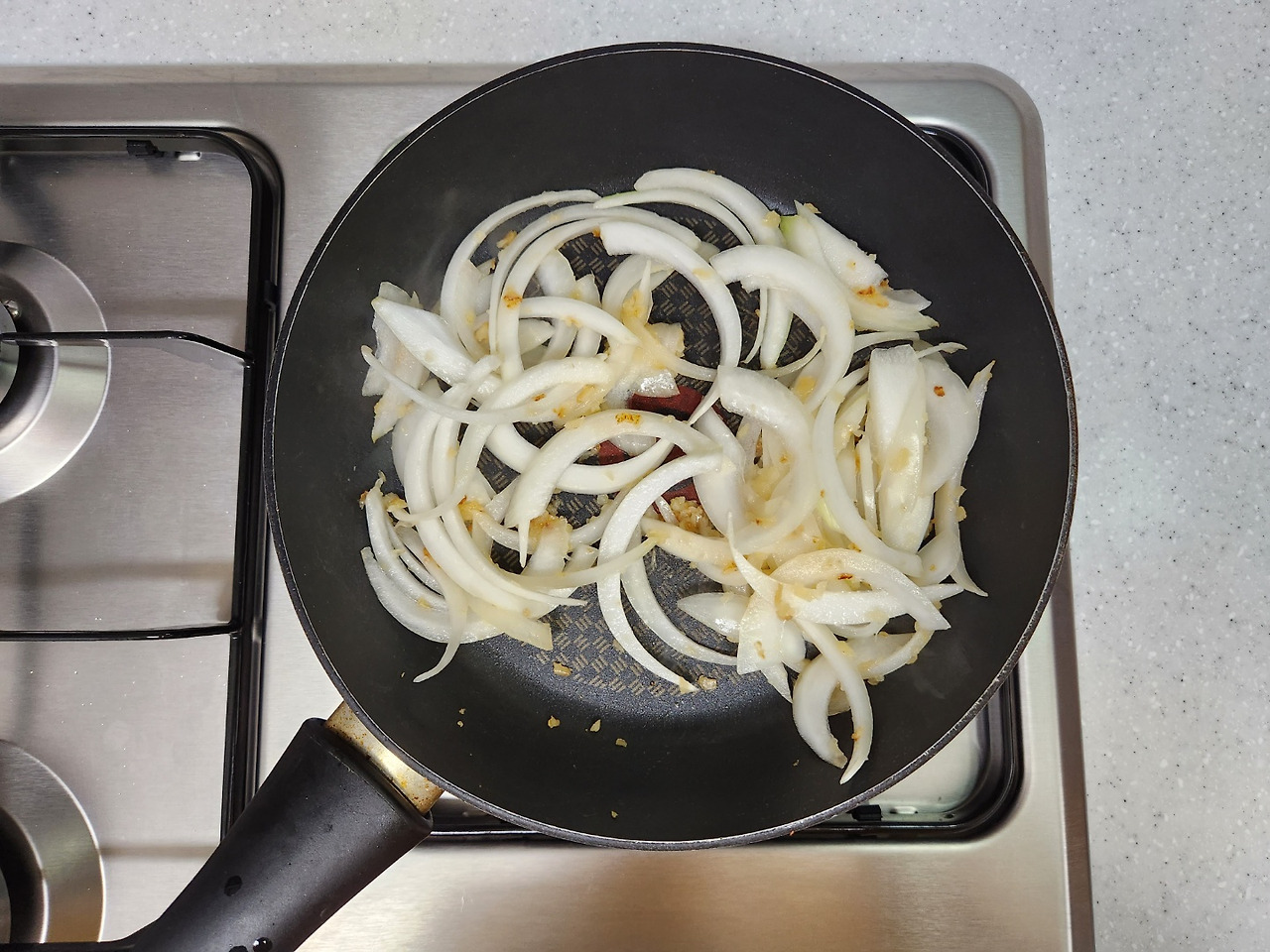 달궈진 팬에 올리브유를 두른다음 고소한 냄새가 날 때까지 마늘을 볶아주세요. 마늘이 다 볶아지면 채썬 양파를 넣고 투명해질 때까지 볶습니다.