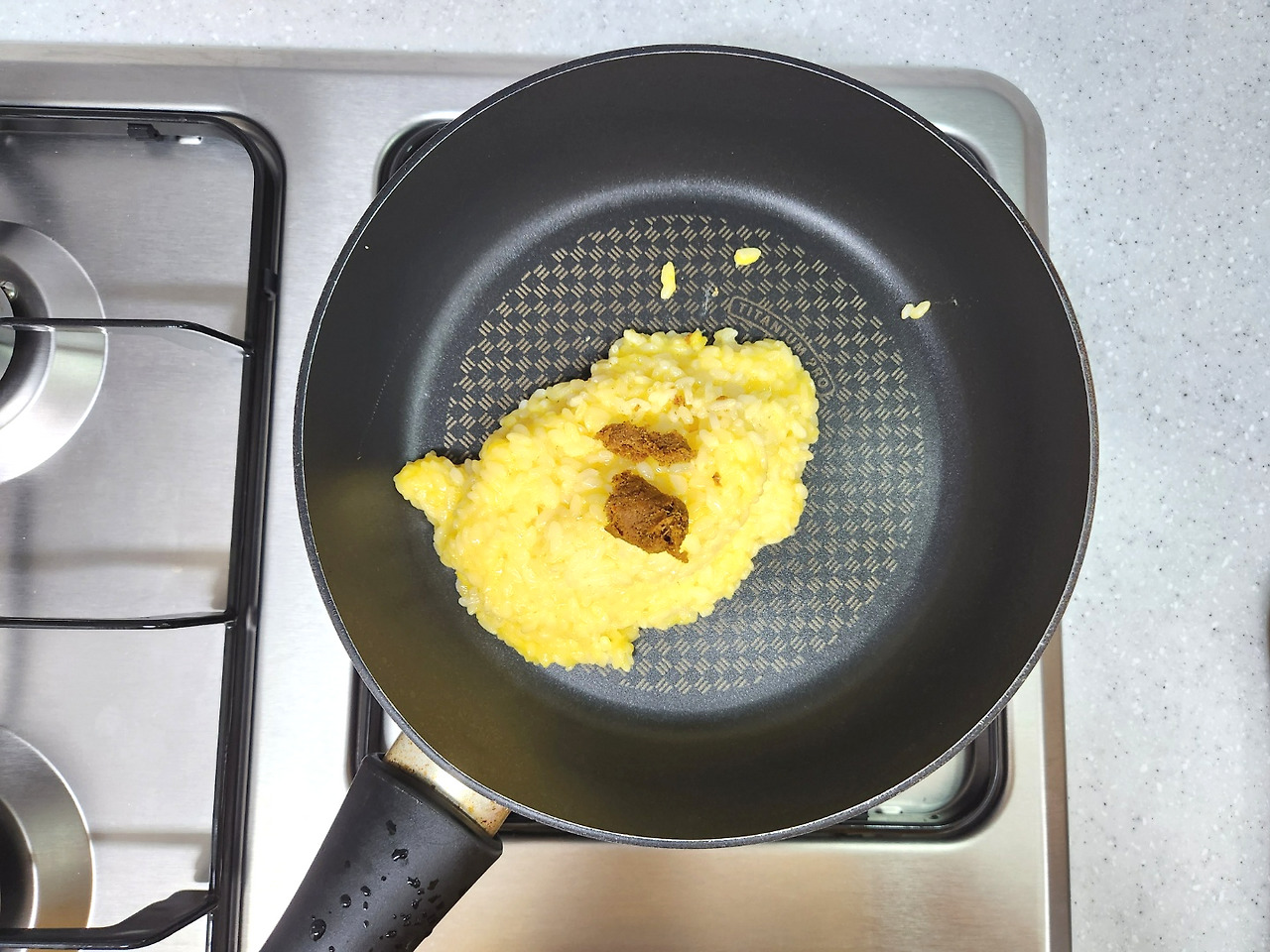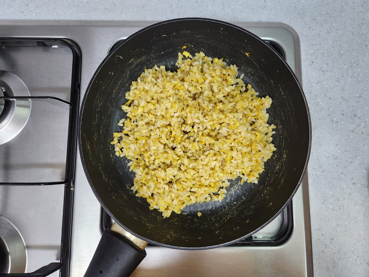 달궈진 팬에 기름 없이 밥과 달걀, 커리페이스트 5g, 후추를 넣고 고슬고슬하게 볶습니다.