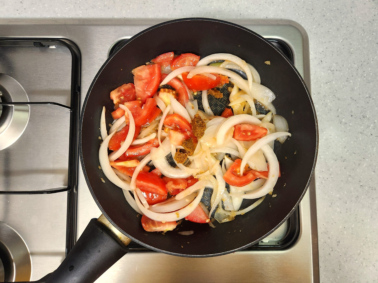 양파가 다 익으면 잘게 썬 토마토, 나머지 커리 페이스트를 넣고 뭉근해질 때까지 잘 볶아줍니다.
