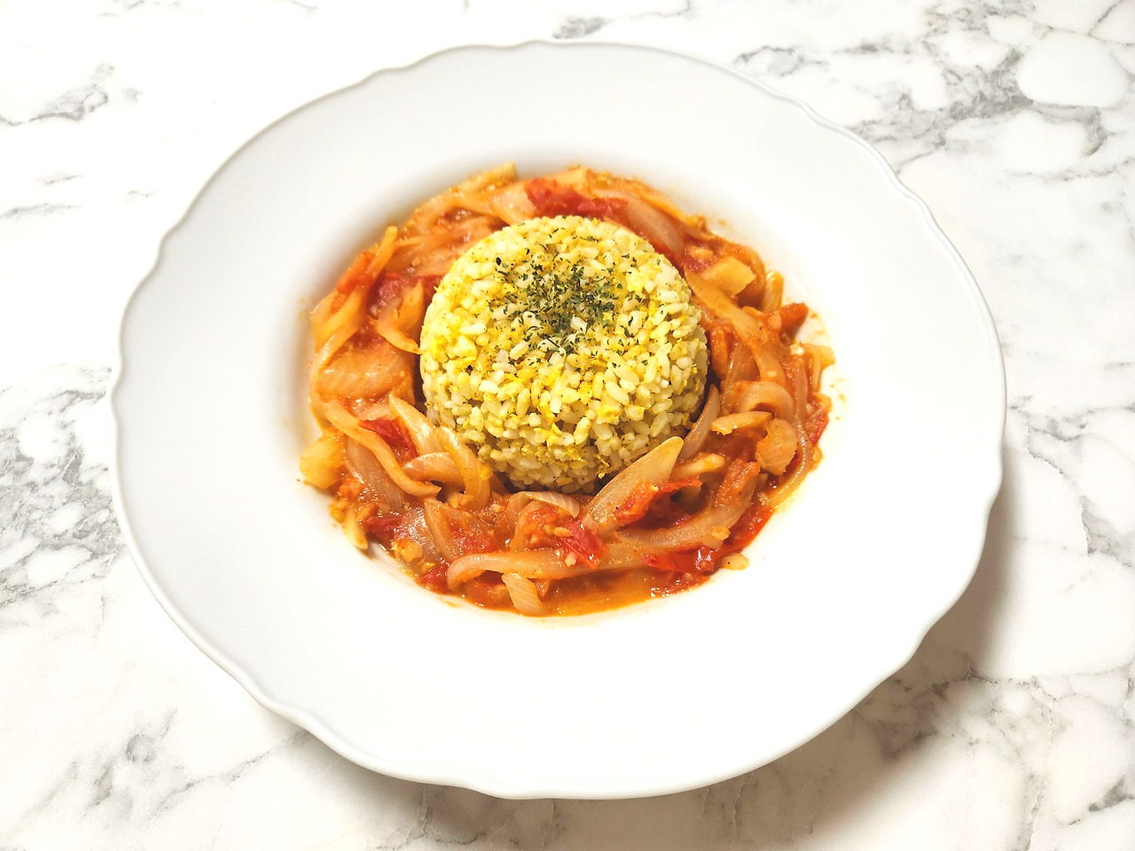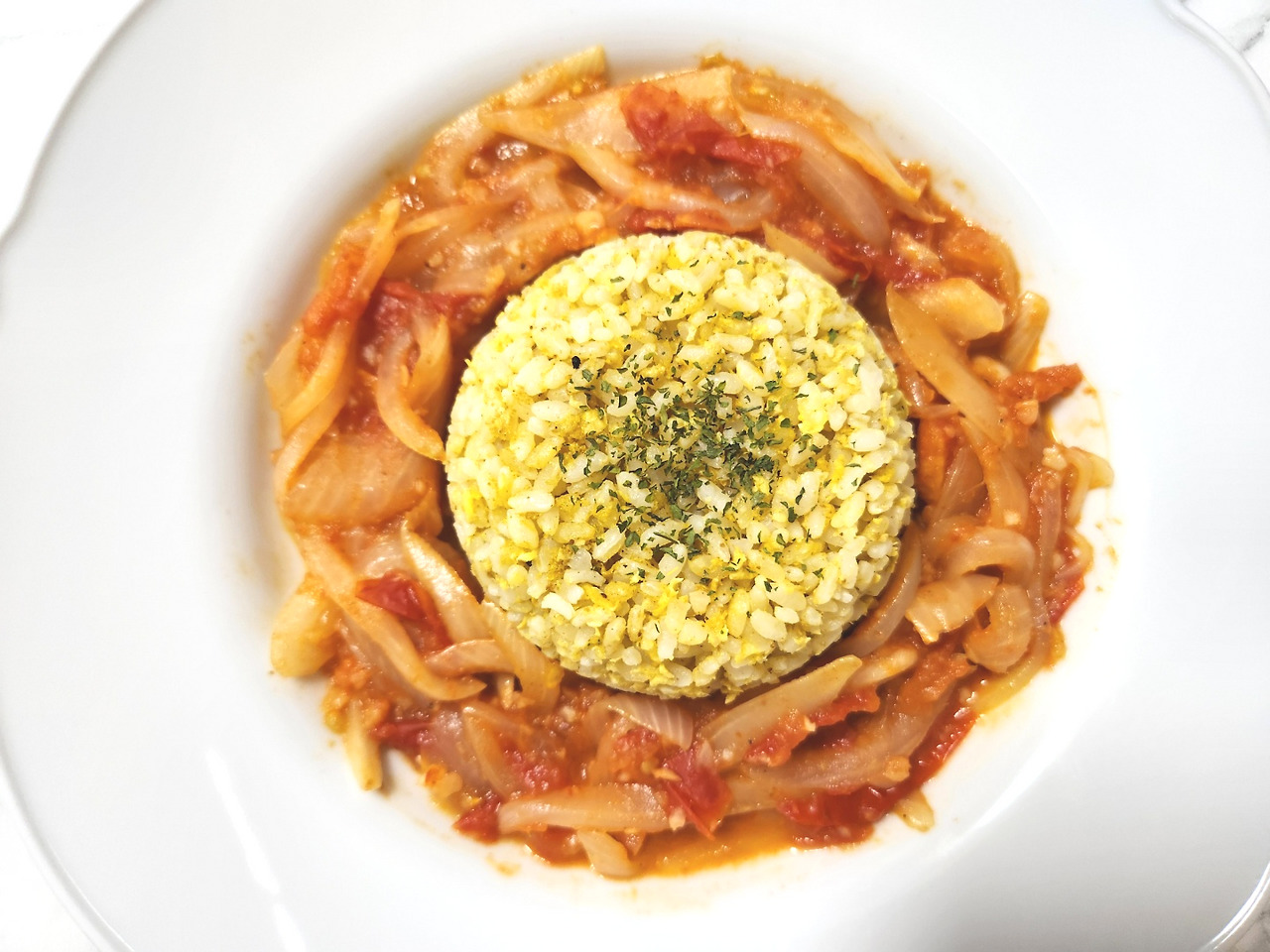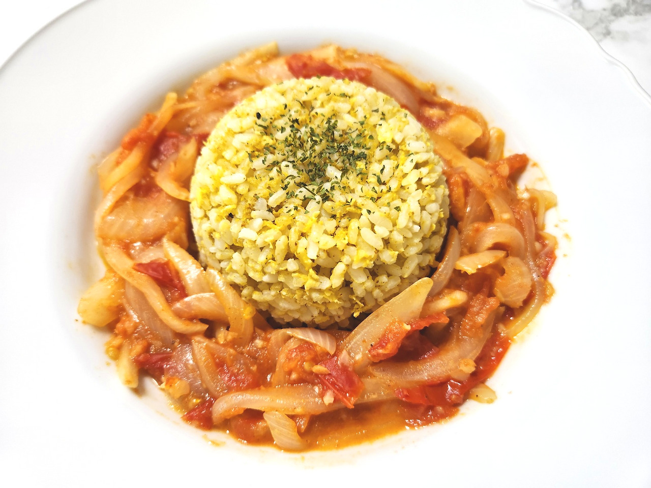 볶음밥 위에 토마토 커리를 얹어 먹으면 감칠맛 도는 커리향이 예술입니다.