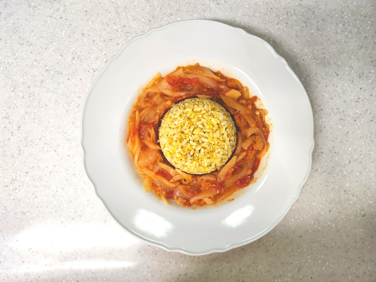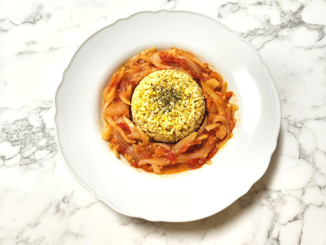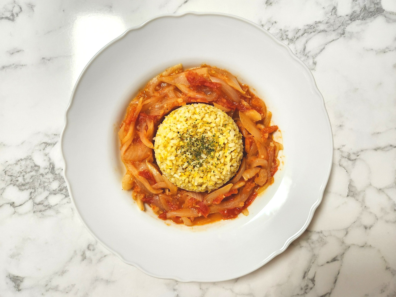 볶음밥 위에 토마토 커리를 얹어 먹으면 감칠맛 도는 커리향이 예술입니다.