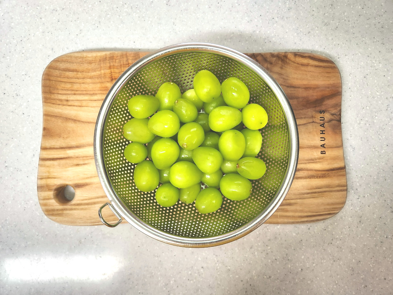 샤인머스캣은 물에 5~10분 정도 담갔다가 한알한알 떼어내 식촛물에 씻습니다.