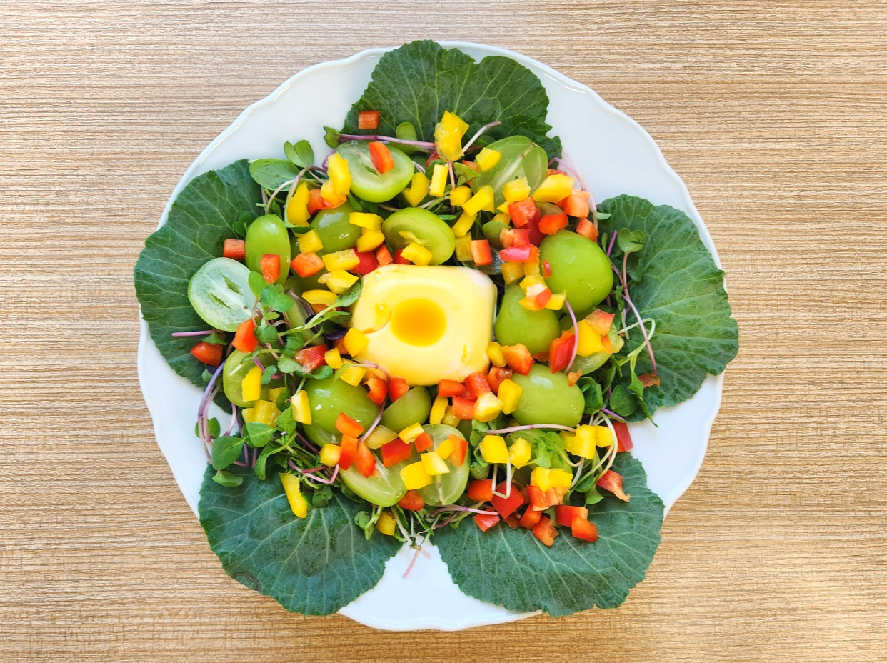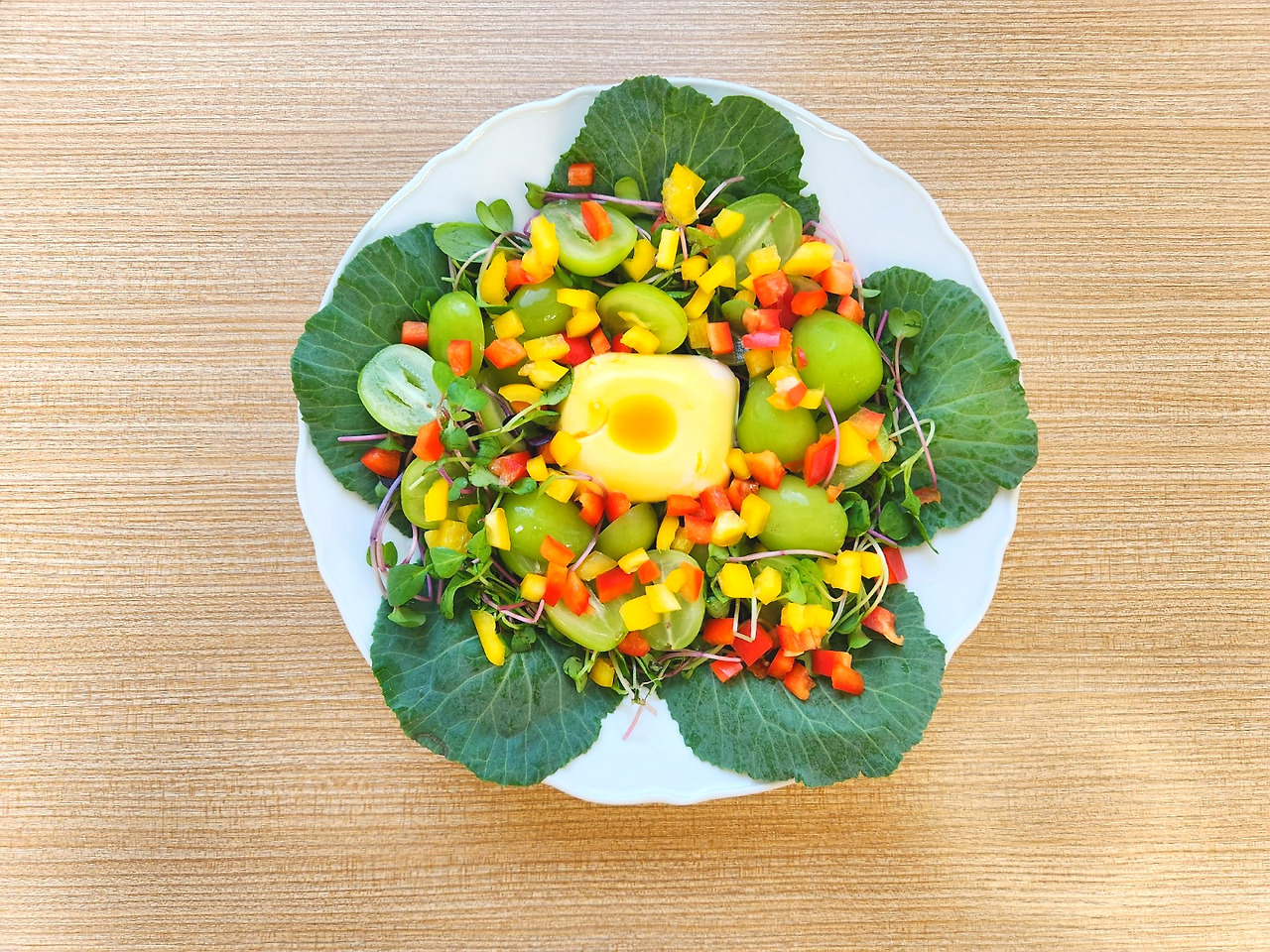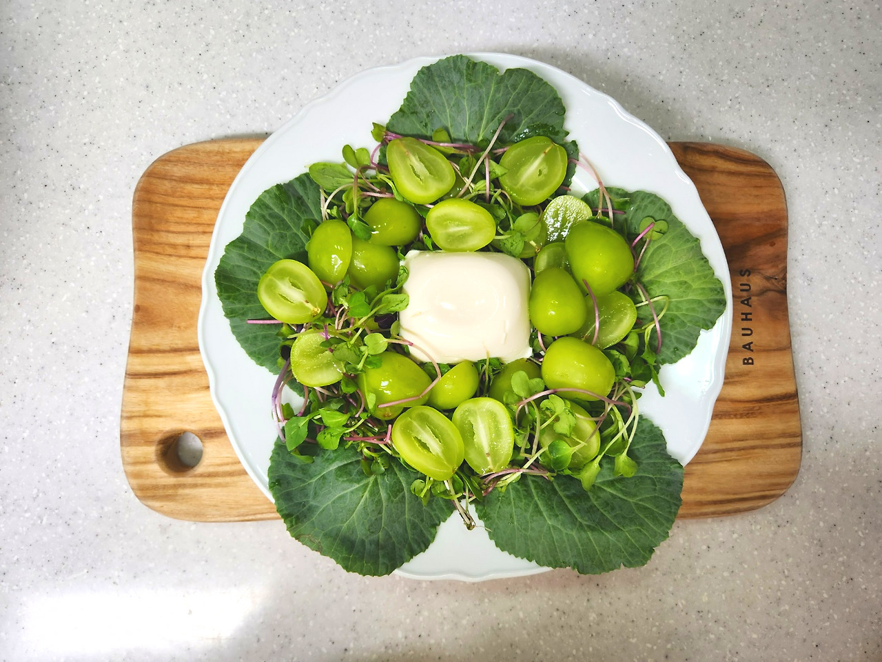 가운데 연두부를 올리고 주변에 반으로 자른 샤인머스캣을 올려줍니다.