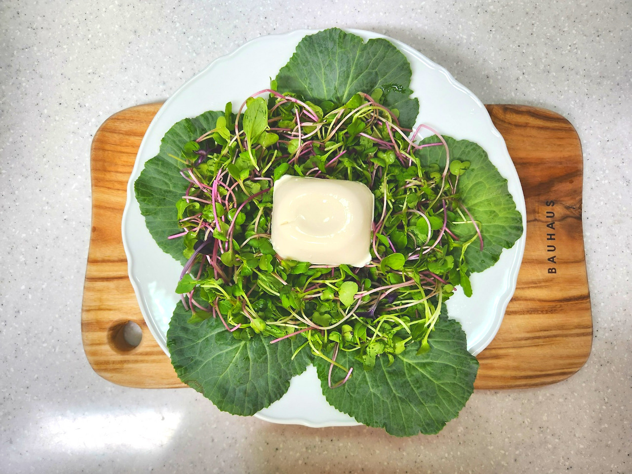 넓은 접시 위에 케일을 꽃잎 모양으로 놓은 다음 새싹채소를 올려줍니다.