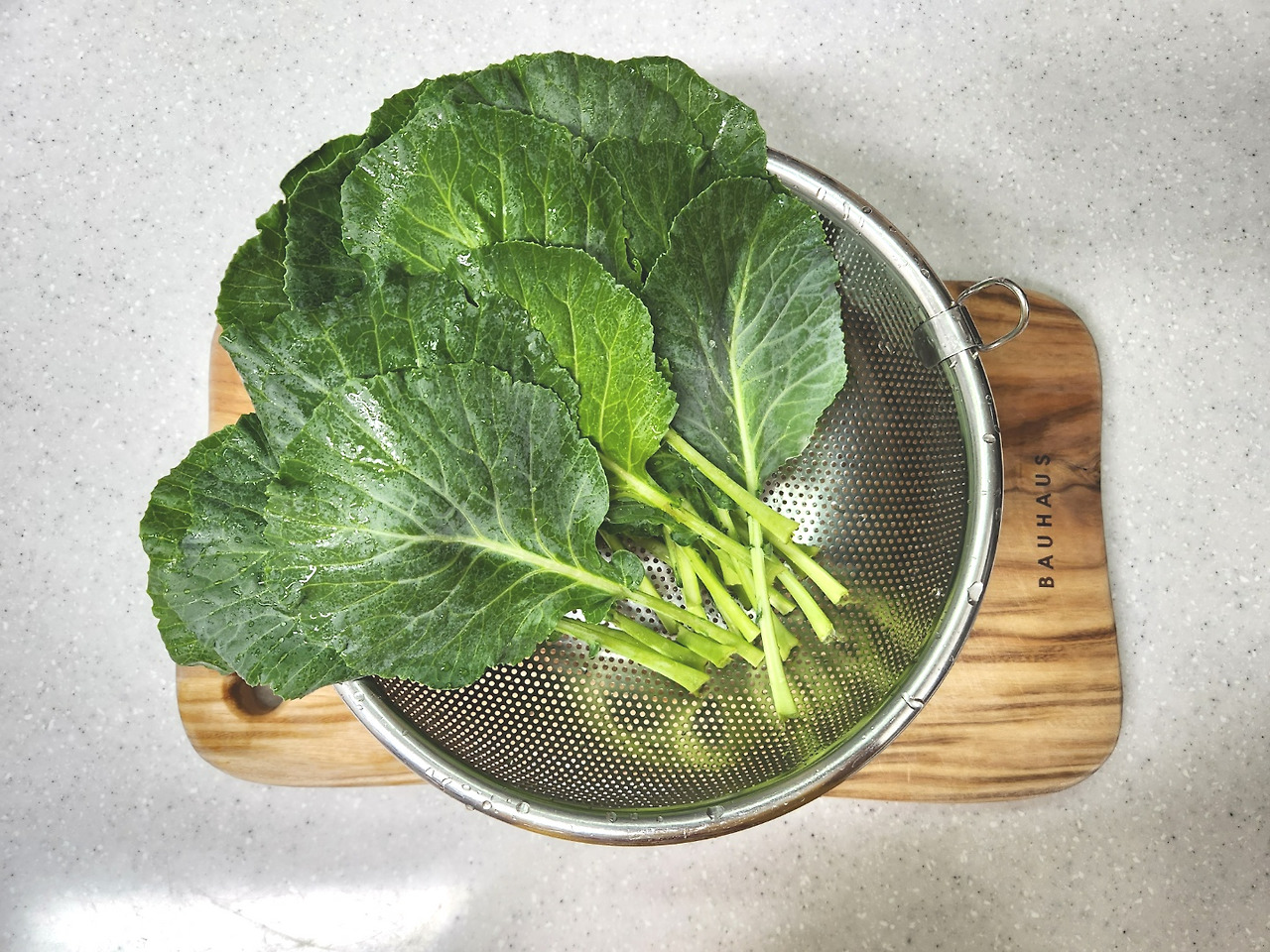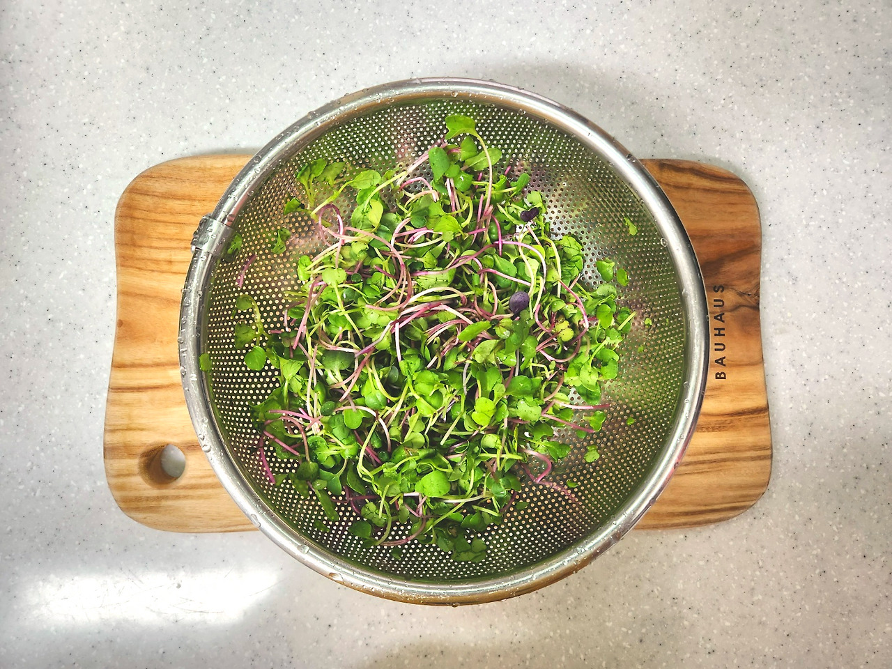 흐르는 물에 케일과 새싹채소를 깨끗이 씻어주세요.