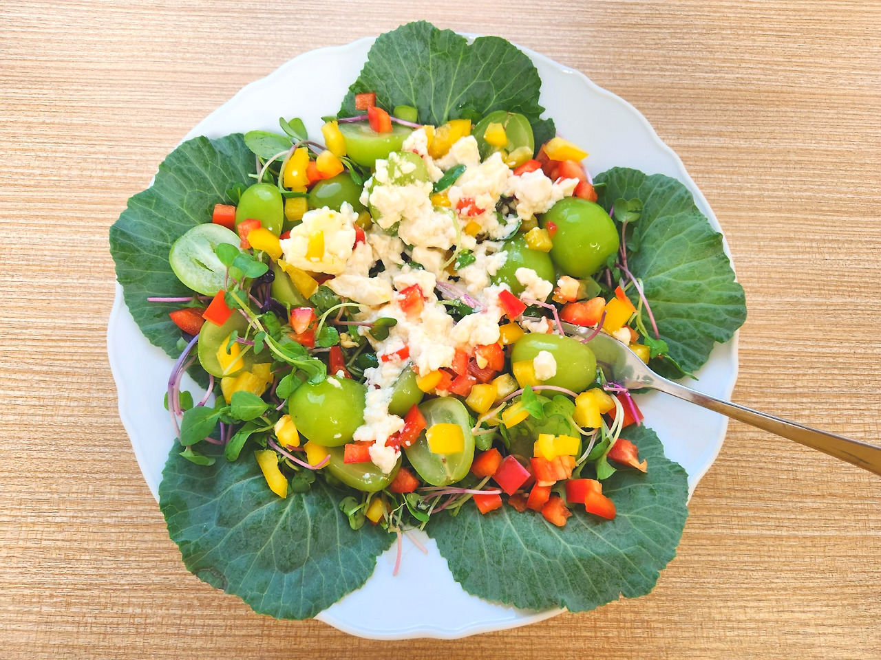 샤인머스캣 위에 파프리카를 토핑처럼 뿌려주세요. 마지막으로 감귤발사믹을 연두부 위에 뿌려주세요.