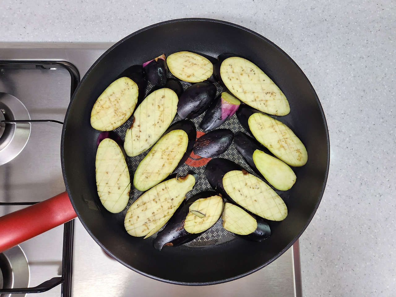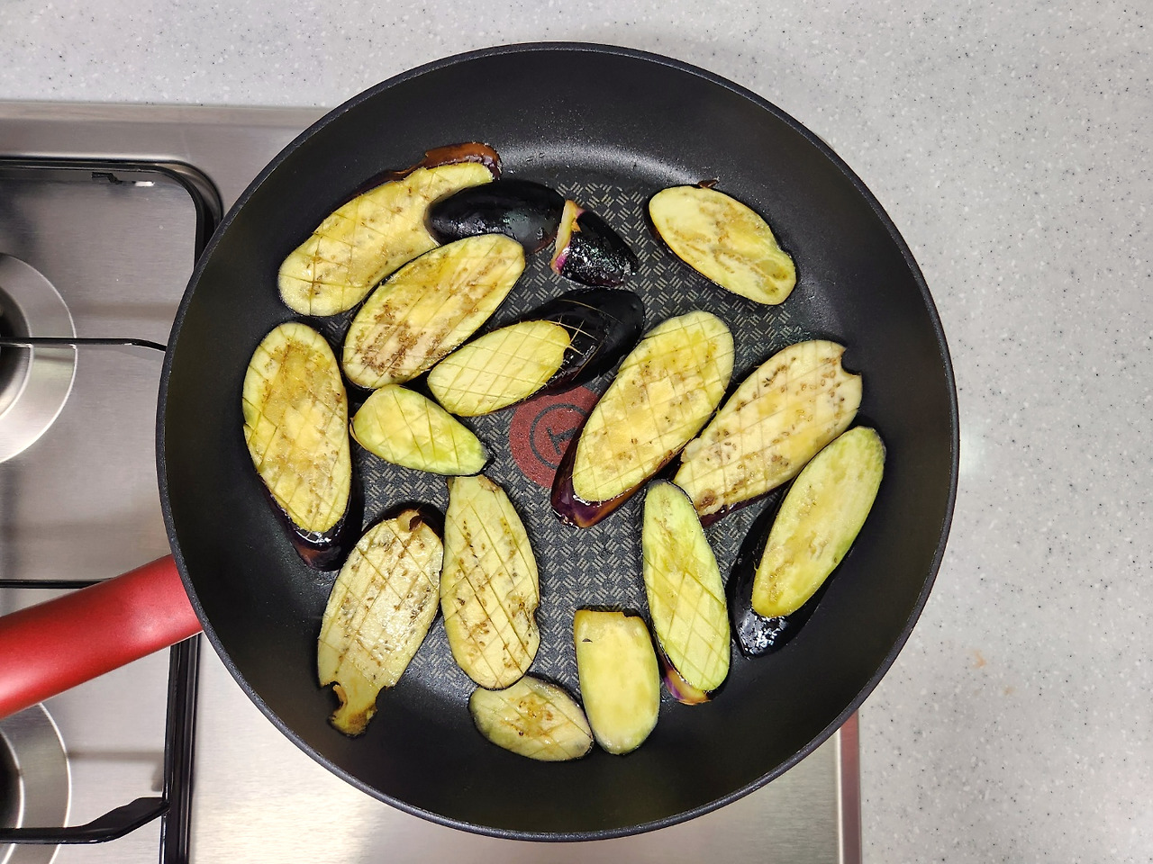 칼집 낸 가지는 들기름에 살짝 구워냅니다.