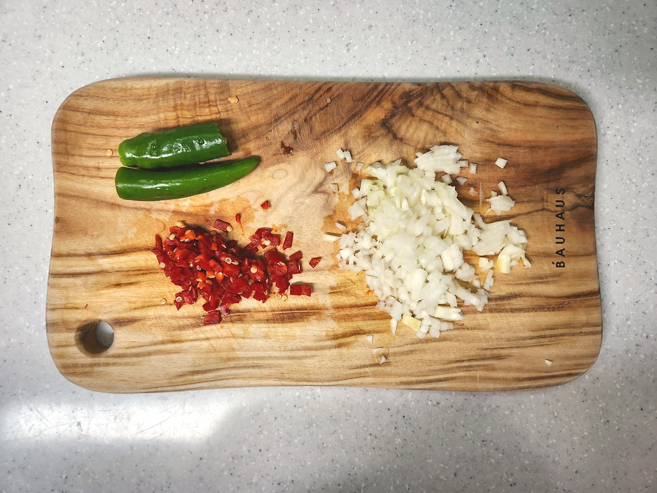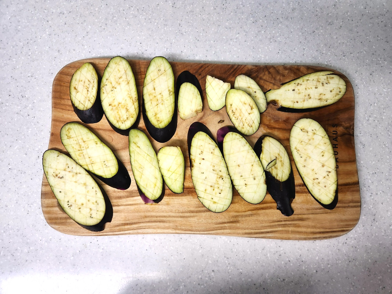 가지는 양면에 가로,세로 칼집을 내고, 양파, 고추는 잘게 다져줍니다.