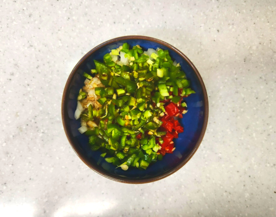 양파 50g, 홍고추 20g, 청고추 20g
