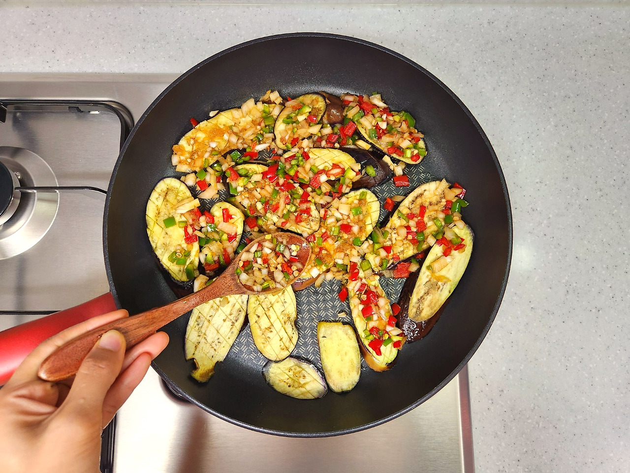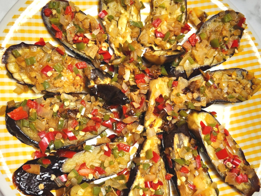 살짝 구운 가지 위에 양념장을 고루 올려줍니다. 간장이 칼집 사이에 잘 들어 가도록 숟가락으로 살짝살짝 눌러주세요. 그런 다음 뚜껑을 덮고 약불에서 서서히 익혀주세요.